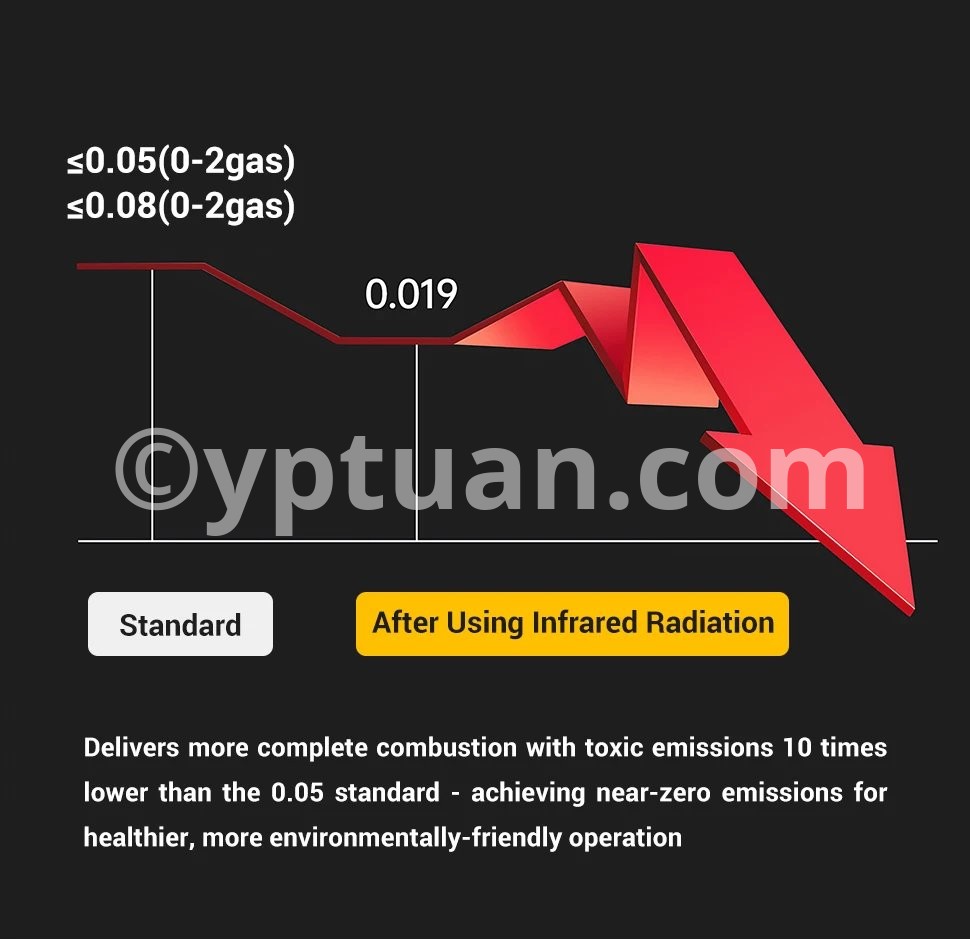 SAFETY: Delivers more complete combustion with toxic emissions 10 times lower than the 0.05 standard - achieving near-zero emissions for healthier, more environmentally-friendly operation