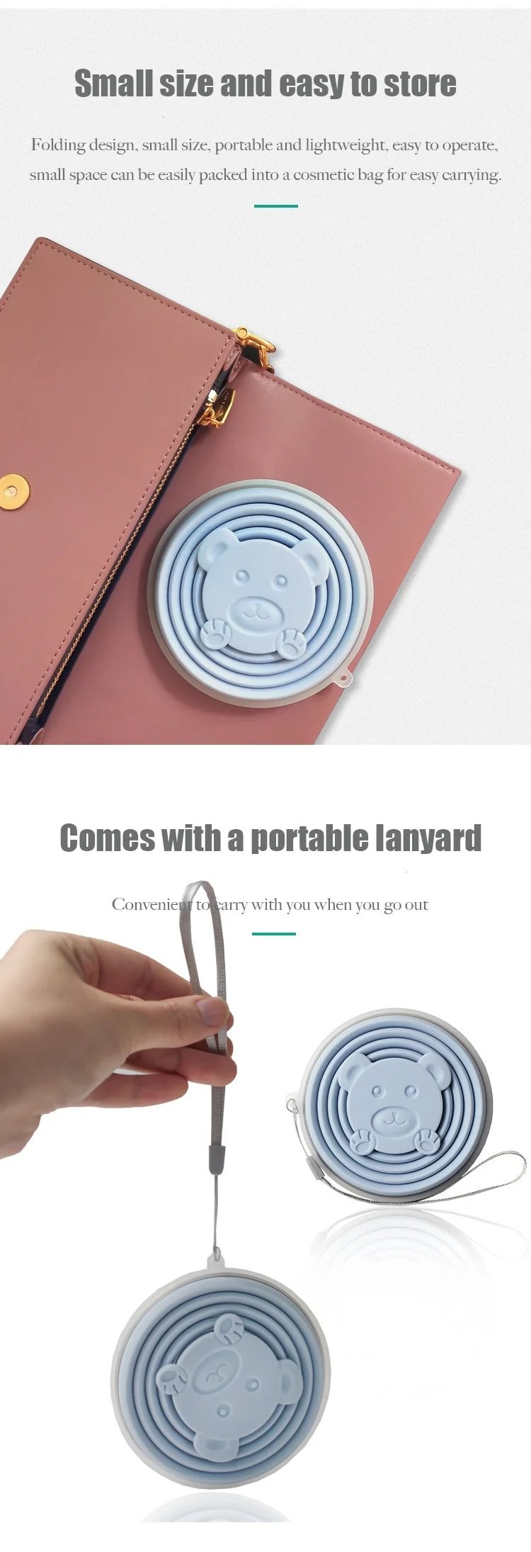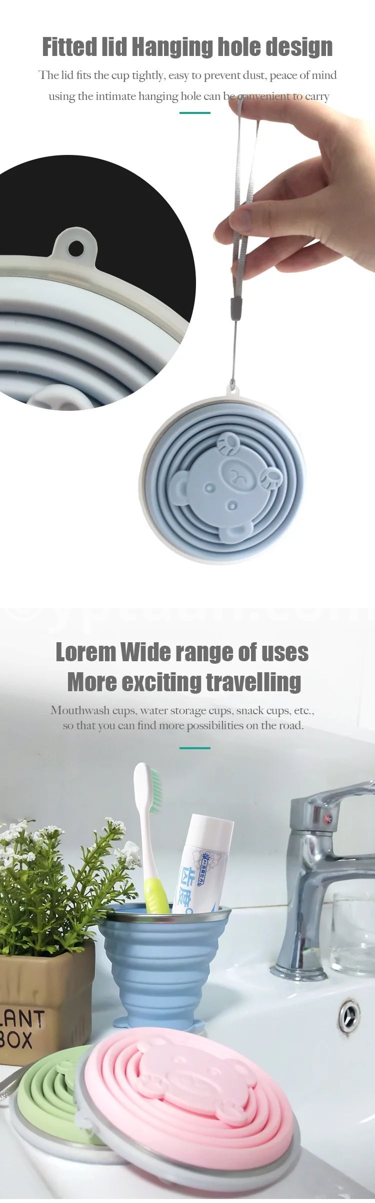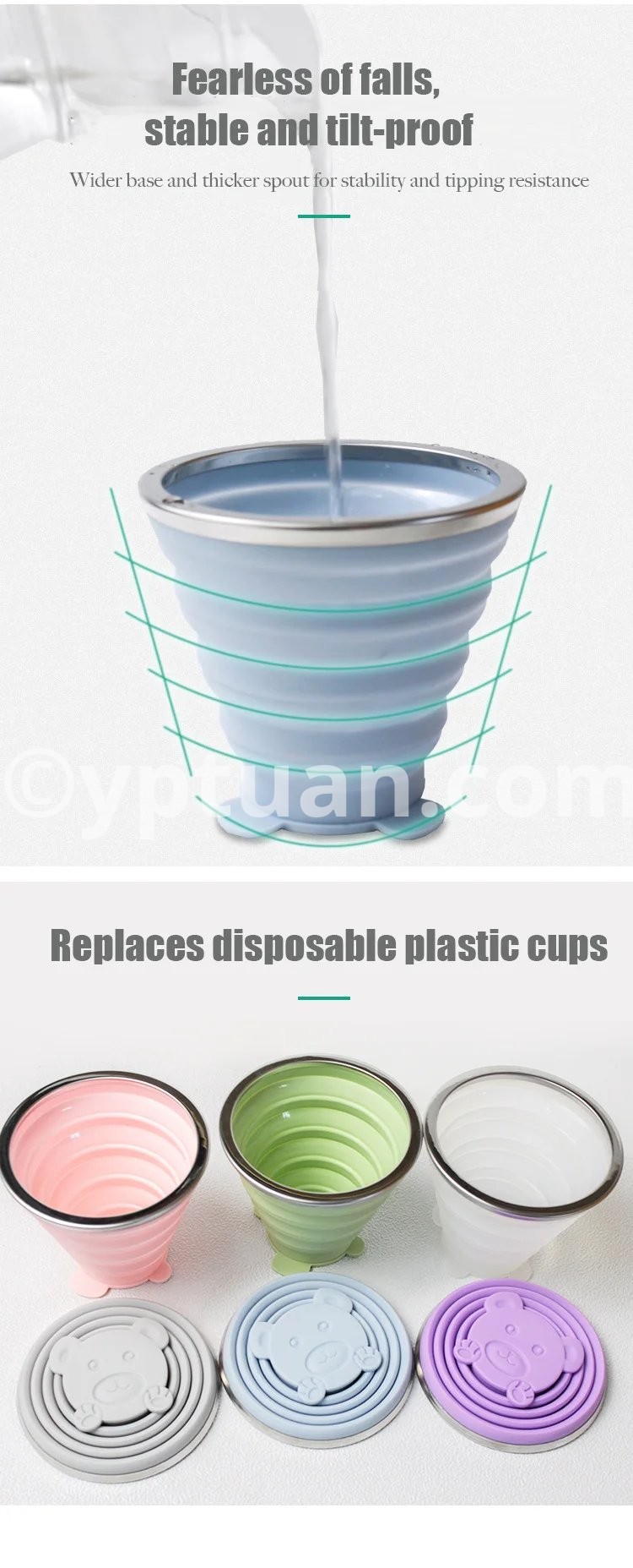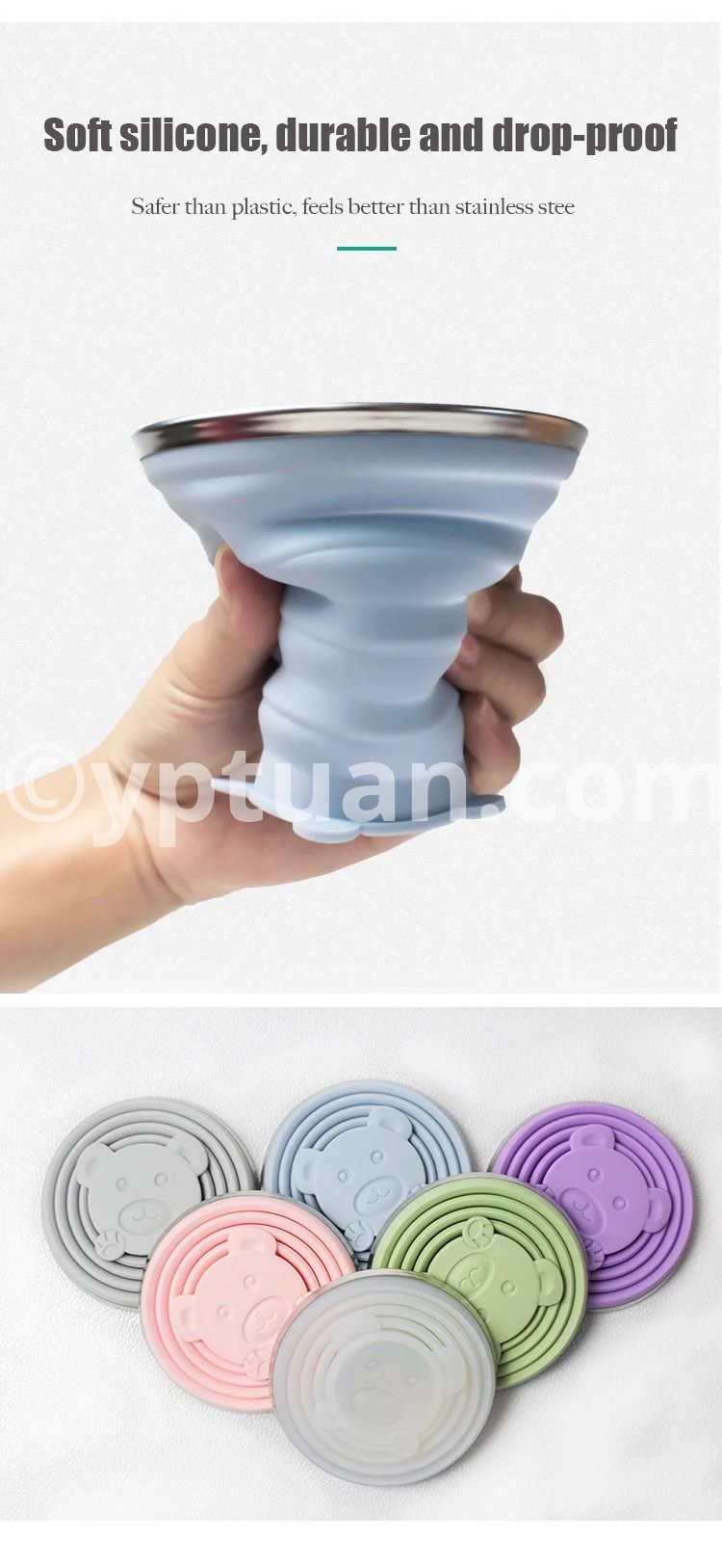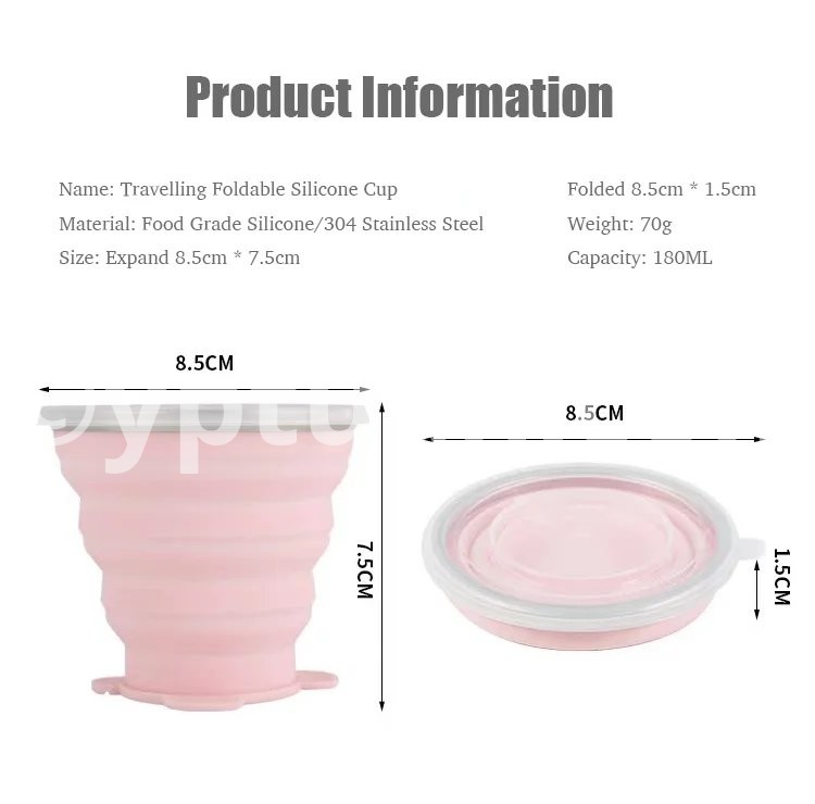 Product Description: Embark on your adventures with the Travel Collapsible Silicone Cup. This innovative cup is crafted from food grade silicone, making it a perfect companion for your travels. Its collapsible design and vibrant colors ensure convenience, style, and safety whether you're on the go or just enjoying a day out. Key Features: Material: High-quality food grade silicone with a 304 stainless steel base. Dimensions: When expanded, 8.5cm * 7.5cm; when collapsed, 8.5cm * 1.5cm. Capacity: 180ML of refreshing capacity for your favorite beverages. Weight: An ultra-light 70g for effortless carrying. Available Colors: Green, Pink, Blue, and Purple to match your personality. Why Choose Our Travel Cup? Soft yet Durable: Enjoy the flexibility and durability that our silicone cup offers, withstanding drops without damage. Safer than Plastic: Rest easy knowing your drink is contained in a BPA-free, non-toxic material. Tactile Experience: Provides a pleasant touch and feel that stainless steel alone can't match. Collapsible Design: Space-Saving: Transforms from a full cup to a compact disc, perfect for minimalist packing. Convenient Carrying: The collapsible feature reduces its volume, making it easy to store and carry. Stability and Portability: Widen Base for Stability: Designed with a widened base and thickened cup mouth for a stable and spill-resistant experience. Portable with a Carrying Loop: Comes with a built-in loop for easy attachment to your bag or belt when on the move. Additional Features: Seamless Lid Design: Ensures a tight seal to keep dust out and your drink fresh. Considerate Hanging Hole: A thoughtfully designed hole on the cup lid for easy hanging when not in use.