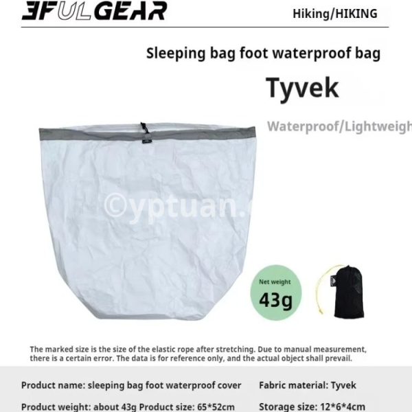 Brand: 3F UL GEAR Size: 65x52cm Fabric: Dyneema Nylon Blend/Tyvek Weight: Dyneema/60g, Tyvek/439