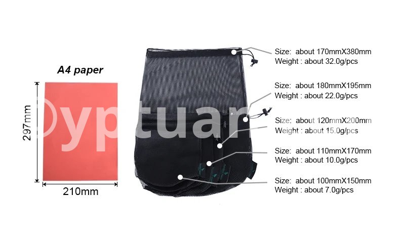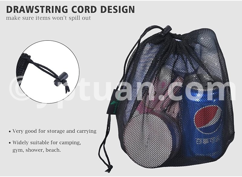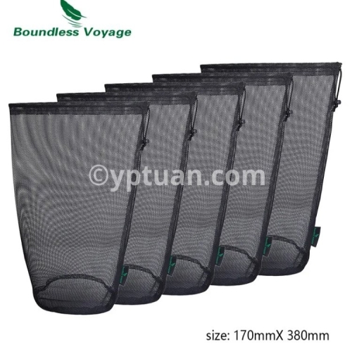 Brand: Boundless Voyage Item: BVP01/BVP02/BVP03/BVP04/BVP05 Material: nylon mesh bag Size and Weight: S: about (D)10*(H)15 cm, 7g M: about (D)11*(H)17 cm, 10g L: about (D)12*(H)20 cm, 15g XL: about (D)18*(H)19.5 cm, 22g XXL: about (D)17*(H)38 cm, 32g Features: 1. Drawstring cord design to make sure items won't spill out; 2. Made of strong nylon mesh bag, ultralight and easy to carry any type of items; 3. Widely suitable for camping, gym, shower, washing toys, beach, also can be applied to wash those delicate items; 4. Very good for storage and carrying. Place of origin: China