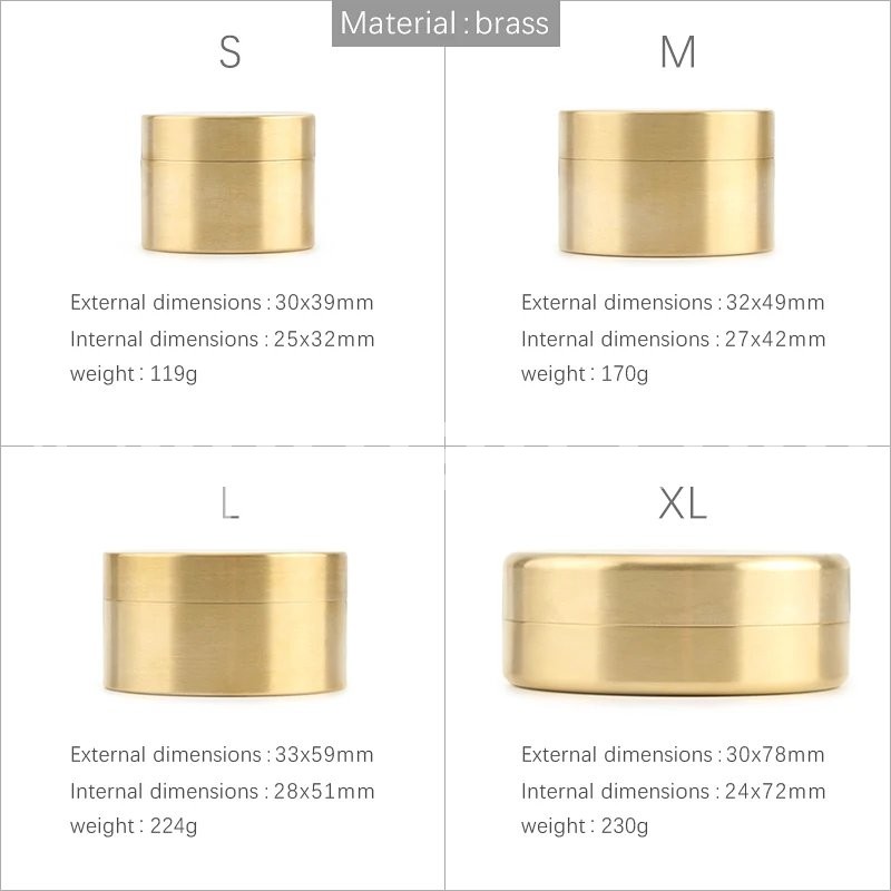 Material: Brass S: Outside Diameter: 39mm. Outside Length: 30mm. Inside Diameter:32mm. Inside Length:25mm. M: Outside Diameter: 49mm. Outside Length: 32mm. Inside Diameter:42mm. Inside Length:27mm. L: Outside Diameter: 59mm. Outside Length: 33mm. Inside Diameter:51mm. Inside Length:28mm. XL: Outside Diameter: 78mm. Outside Length: 30mm. Inside Diameter:72mm. Inside Length:24mm. Note: 1. The Size is Measured Manually. There May Be a Slight Margin of Error. 2. The Weight is for Reference Only, the Weight of Each Batch Will Be Different.