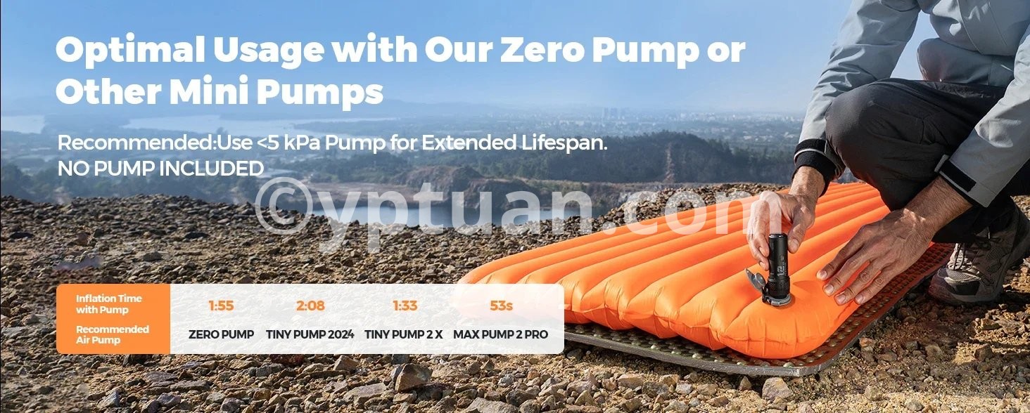 Our sleeping pad is designed to be quickly inflated with the use of an air pump. By using an air pump, you not only save time and effort but also ensure the integrity of the aluminum-coated cotton insulation (Pump is not included).