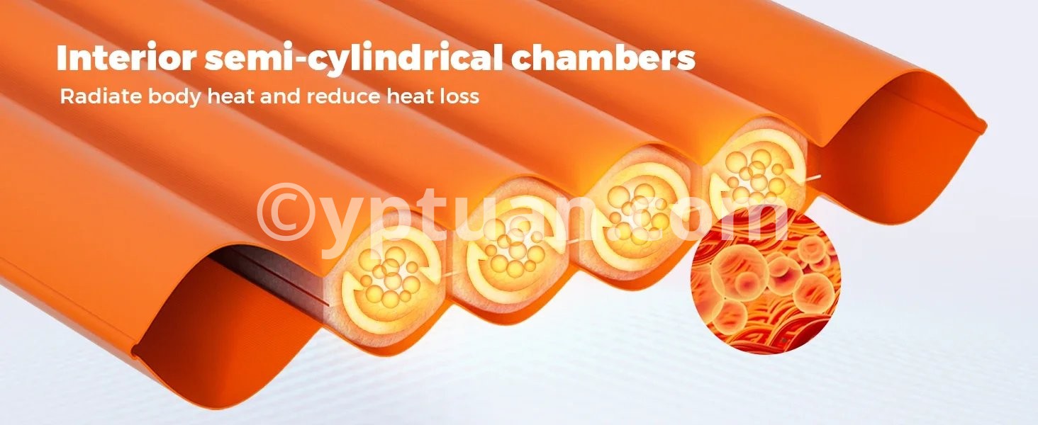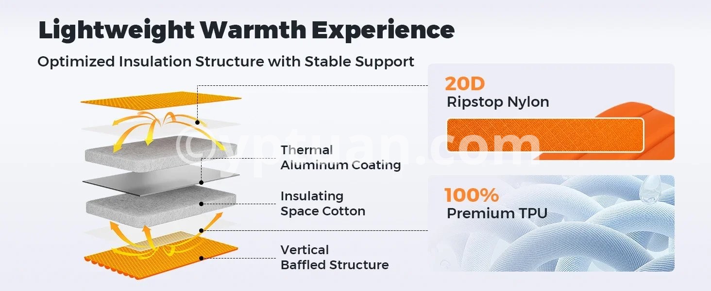 The surface material is made of high-quality 20D nylon, which is known for its strength and resistance to wear and tear. The filling material consists of 240g/m² aluminum-coated cotton, a perfect combination of polyester fiber and PET aluminum coating that provides both insulation and longevity.