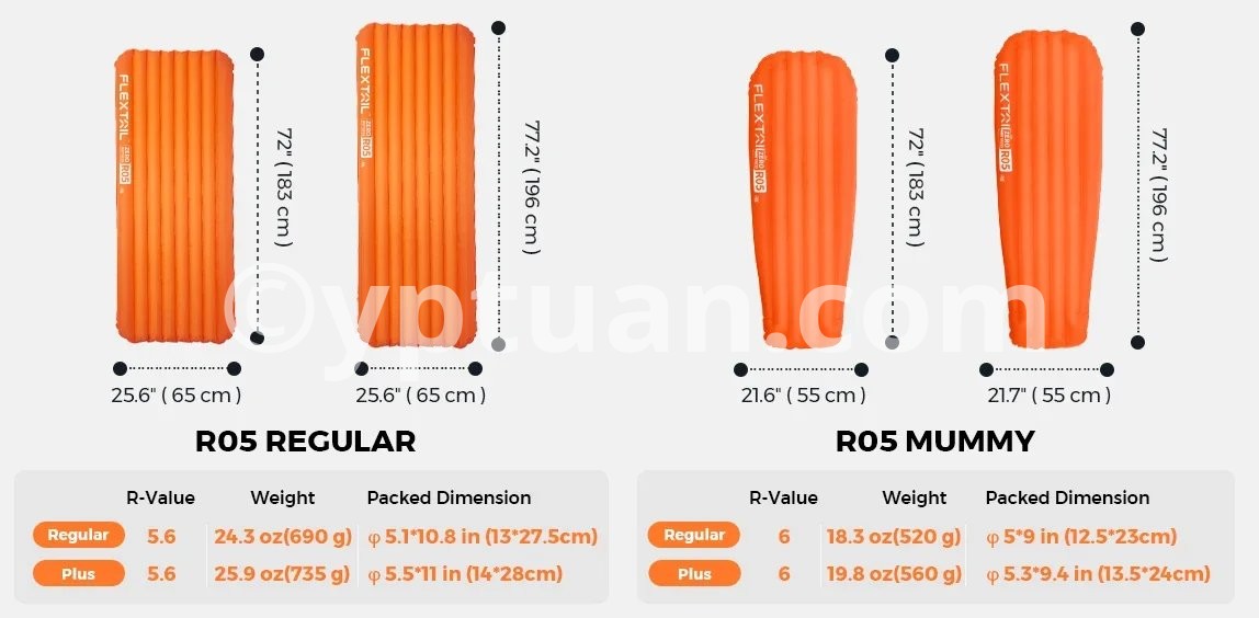 MUMMY: With an R6.0 Value, this sleeping pad is designed for extreme cold, offering a comfortable rating of -18℃ (-0.4°F) and an extreme limit of -26℃ (-14.8°F).