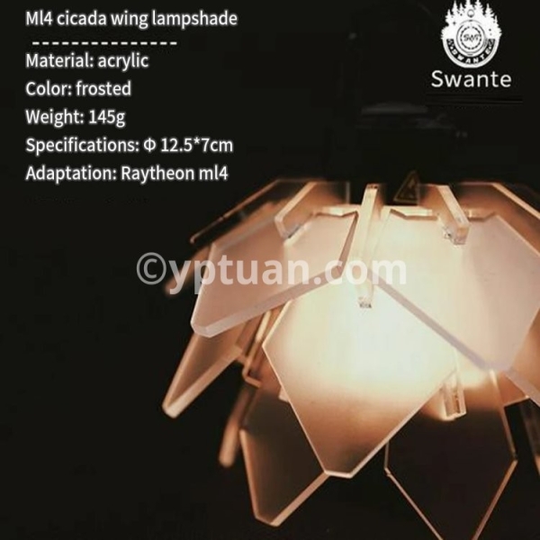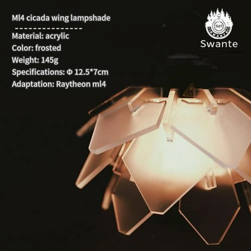 Description: SWANTE handmade studio produces atmosphere lampshade, with exclusive tactical style tripod and lamp stand to provide a different visual experience (SWANTE will update a series of new products in the near future, you can contact the concerned store or directly contact customer service for consultation) ML4 Cicada Wing Lampshade01/02 ------- Material: acrylic Color: frosted, transparent Weight: 145g Specifications: 12.5*7cm Adaptation: Thor ML4 Specifications: Please pay attention when purchasing this product! ! ! 01/02 The product comes in loose pieces and needs to be installed manually by the customer. Installation videos can be provided. Before purchasing the product, please note that the product needs to be assembled by the customer. 01/02 needs to be installed with glue. Camping atmosphere lampshade is the first choice, and there will be more new lampshades in the future, crafted by craftsmen In the follow-up, Swante will continue to update the products of the blackening series, you can pay attention to the update of the store Package Included: 1* Lampshade