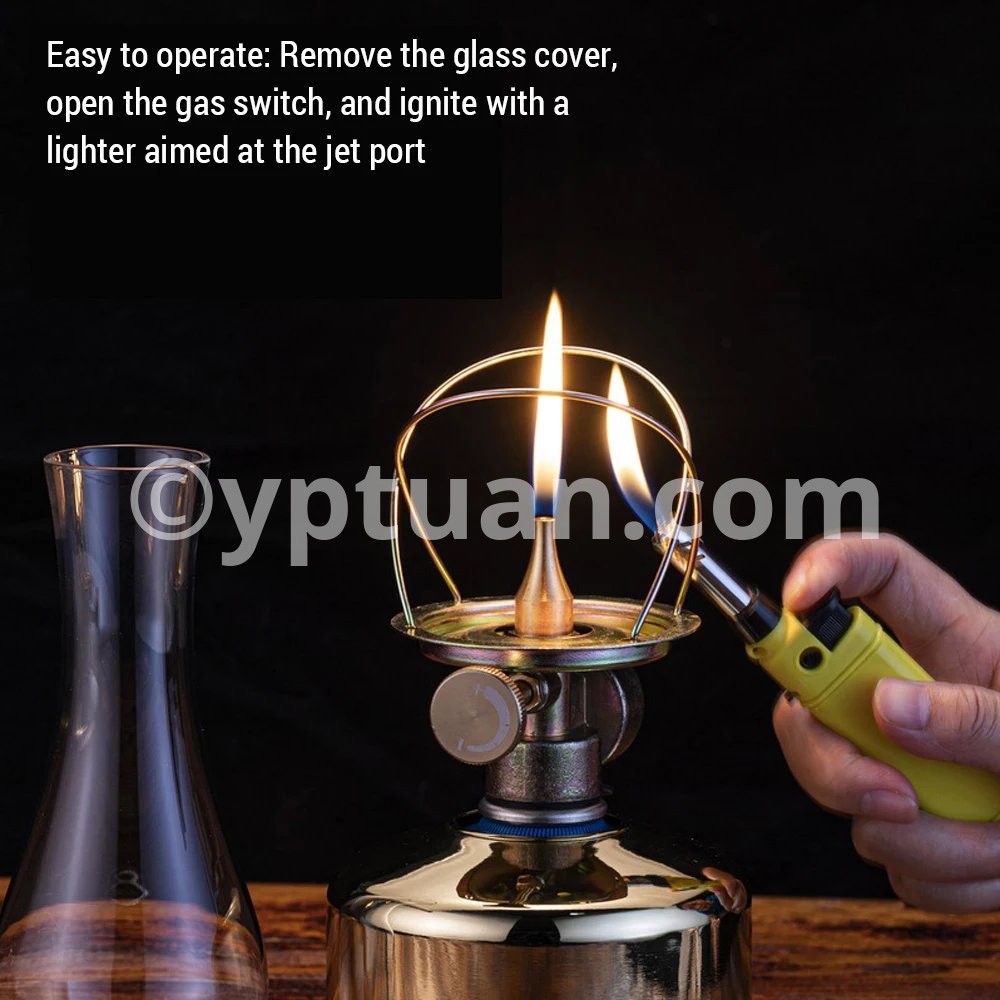 Easy to operate: Remove the glass cover, open the gas switch, and ignite with a lighter aimed at the jet port.
