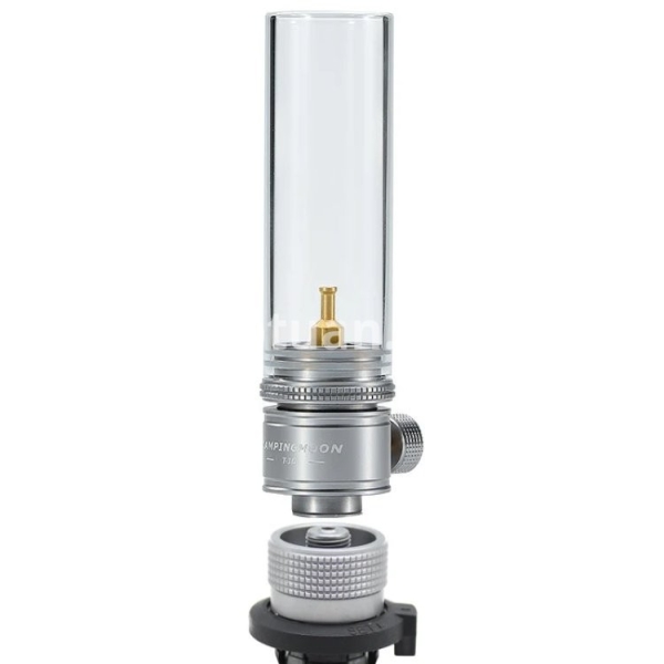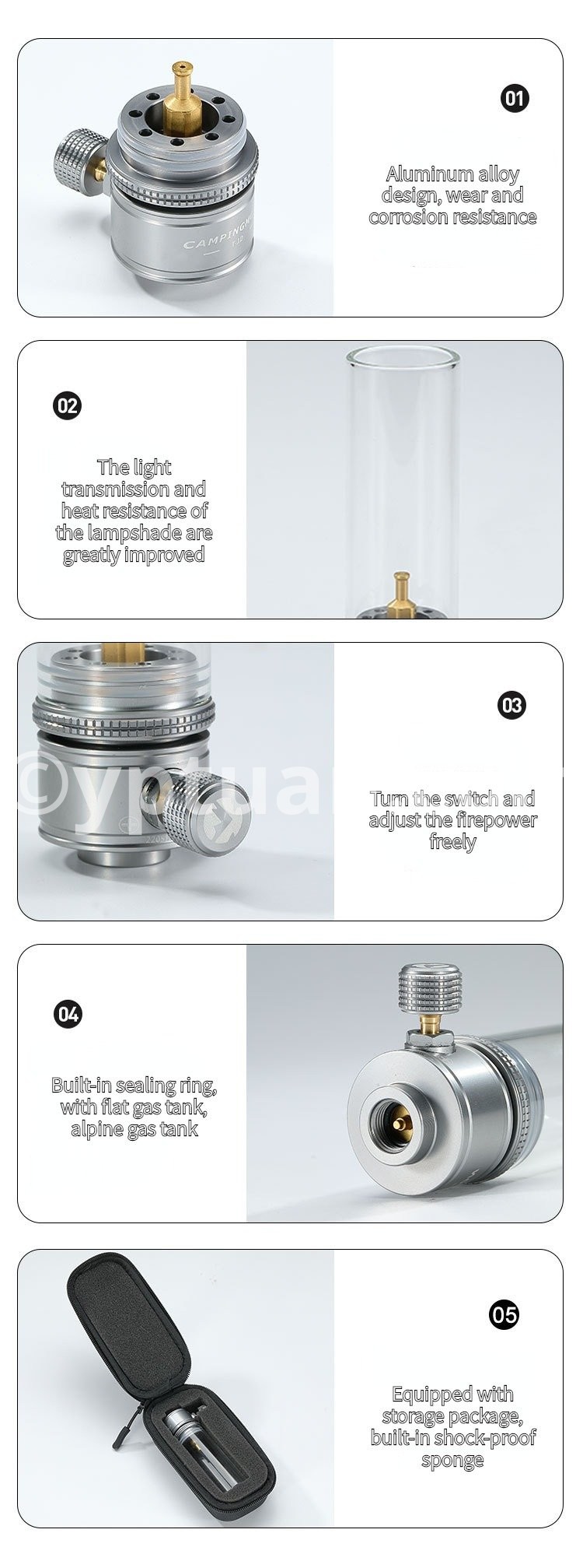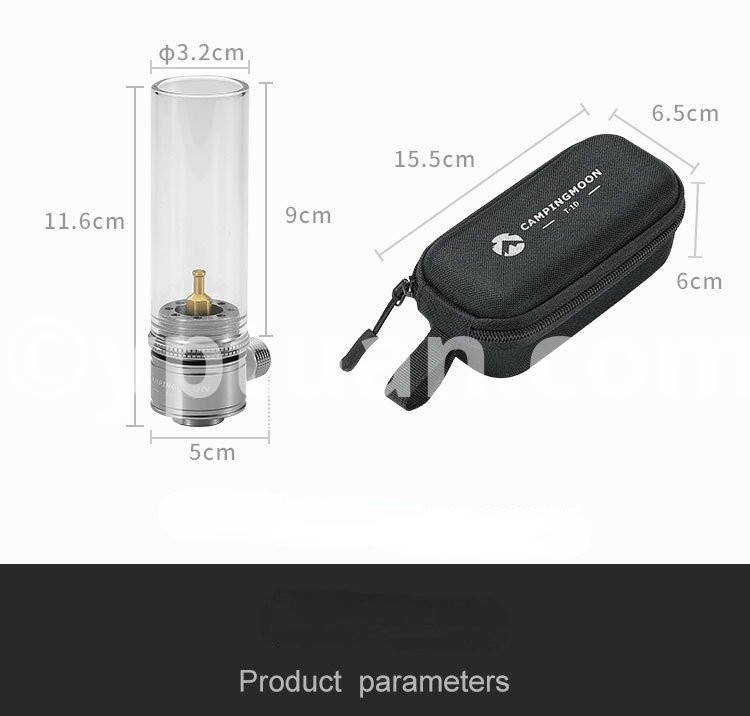 Product Description Product name: Camping gas Lamp Model: T-1D Weight: 198g (including storage bag) Color: Transparent Material: glass, copper, aluminum alloy, stainless steel, silicone Size: 5 * 3.2 * 11.6cm (candle lamp) 6.5 * 15.5 * 6cm (storage bag) Installation: The lampshade can be directly pulled out to remove the glass cover; When installing the glass cover, all the damping rubber rings need to be placed in the glass cover before fixing the glass cover.