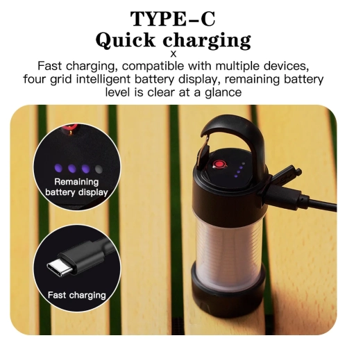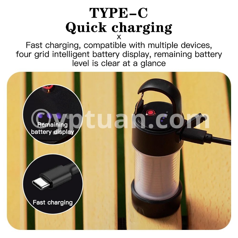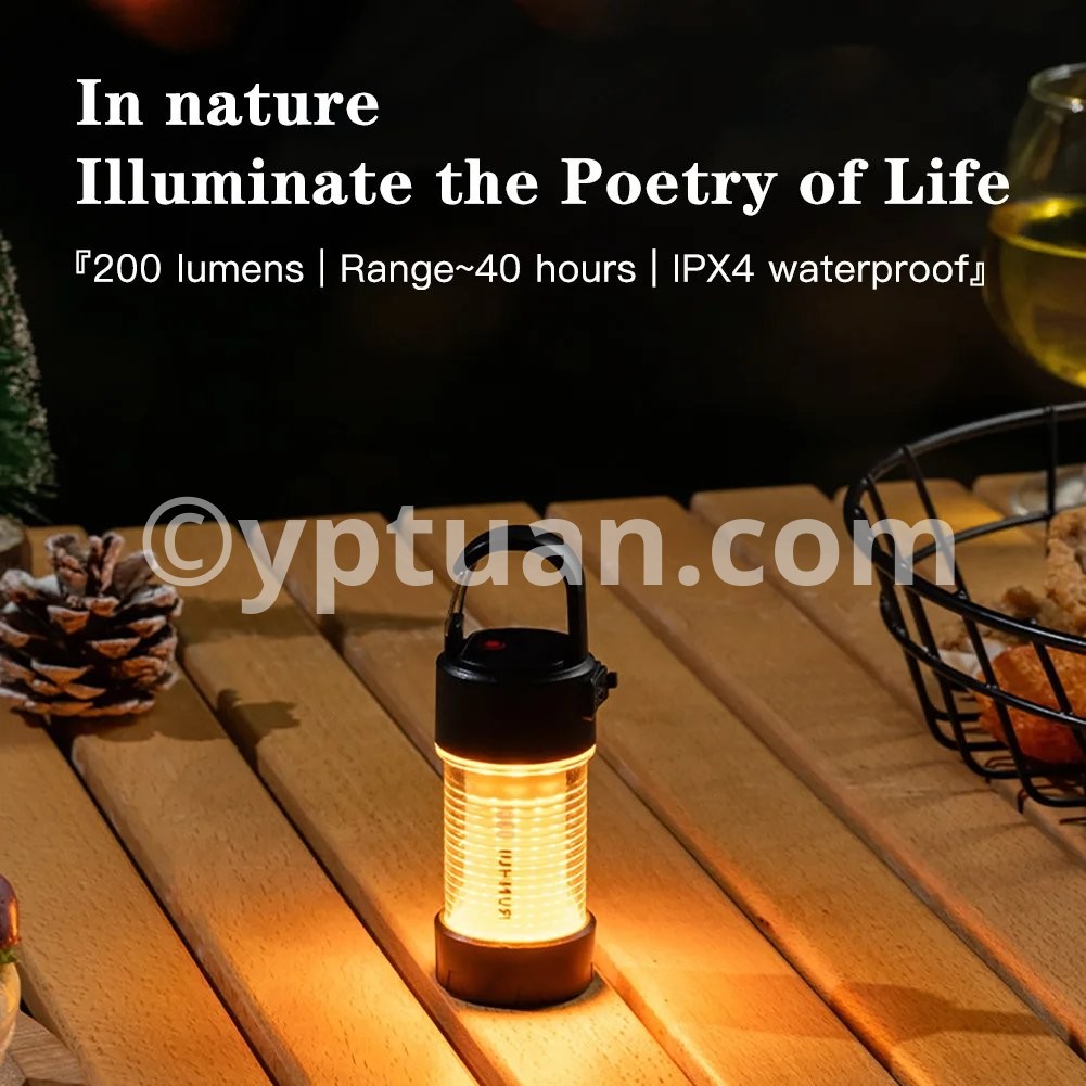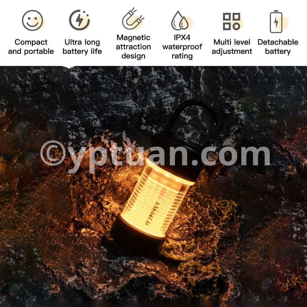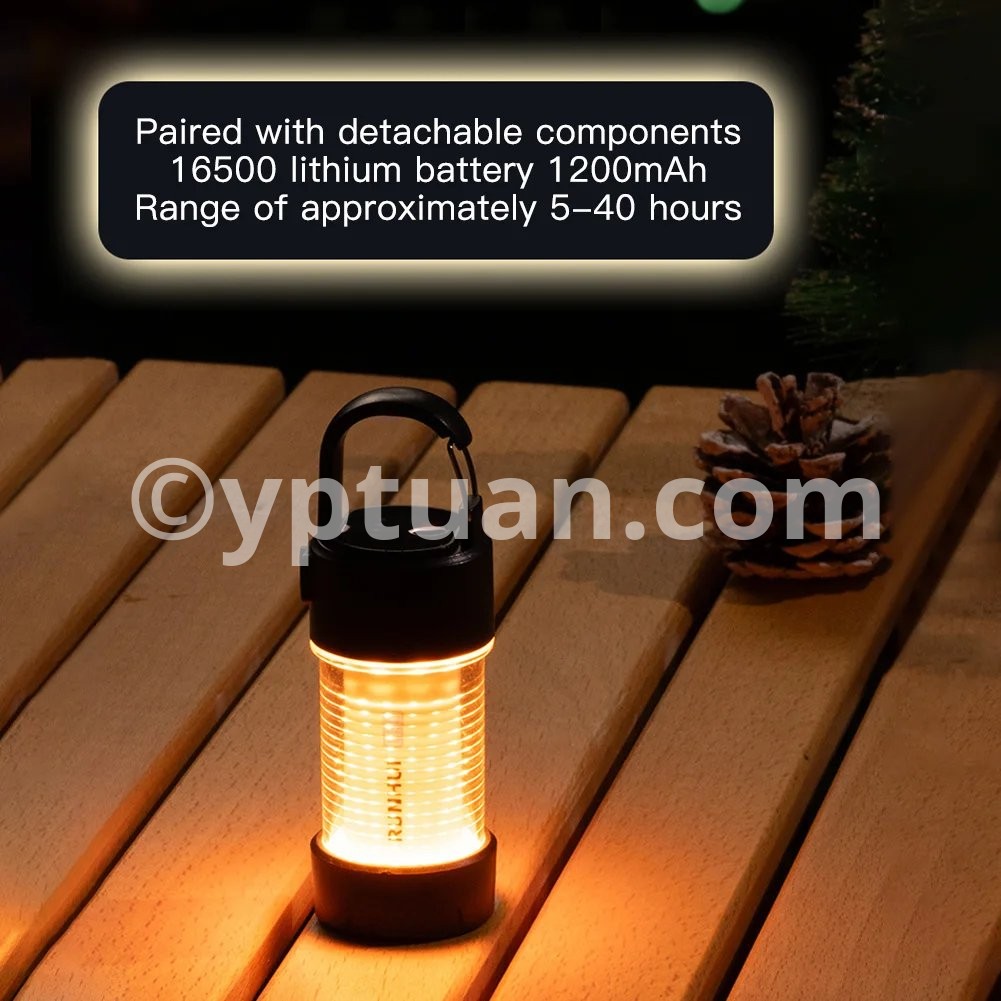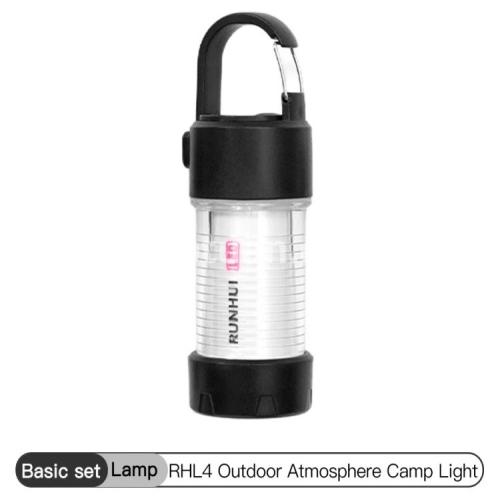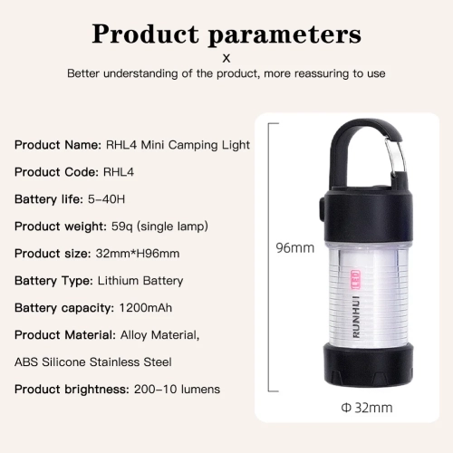 Product Name: RHL4 Mini Camping Light Battery life: 5-40H Product weight: 59g (single lamp) Product size: ф 32mm * H96mm Battery Type: Lithium Battery Battery capacity: 1200mAh Product Material: Alloy Material, ABS Silicone Stainless Steel Product brightness: 200-10 lumens