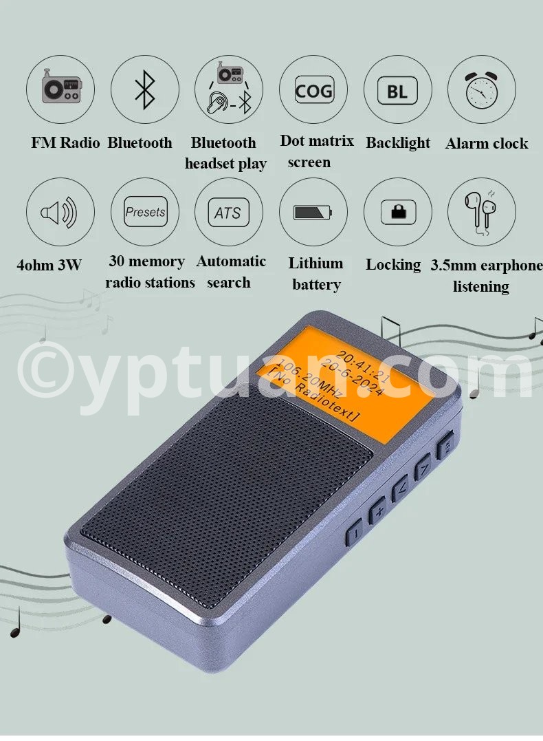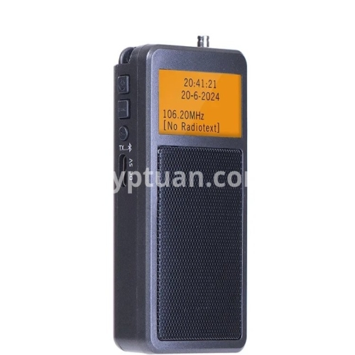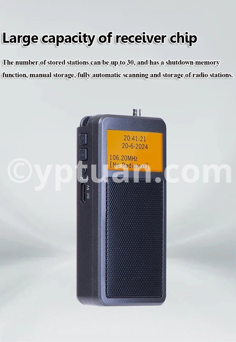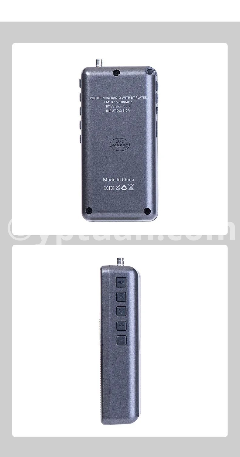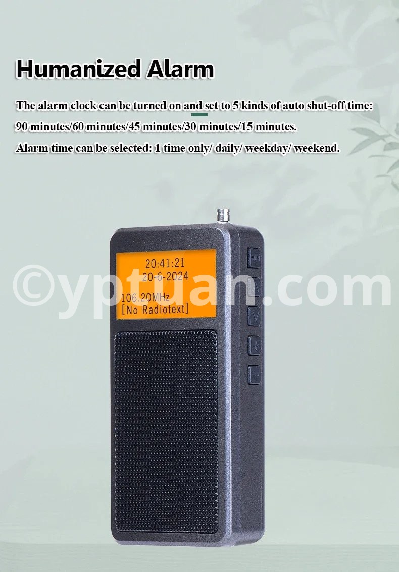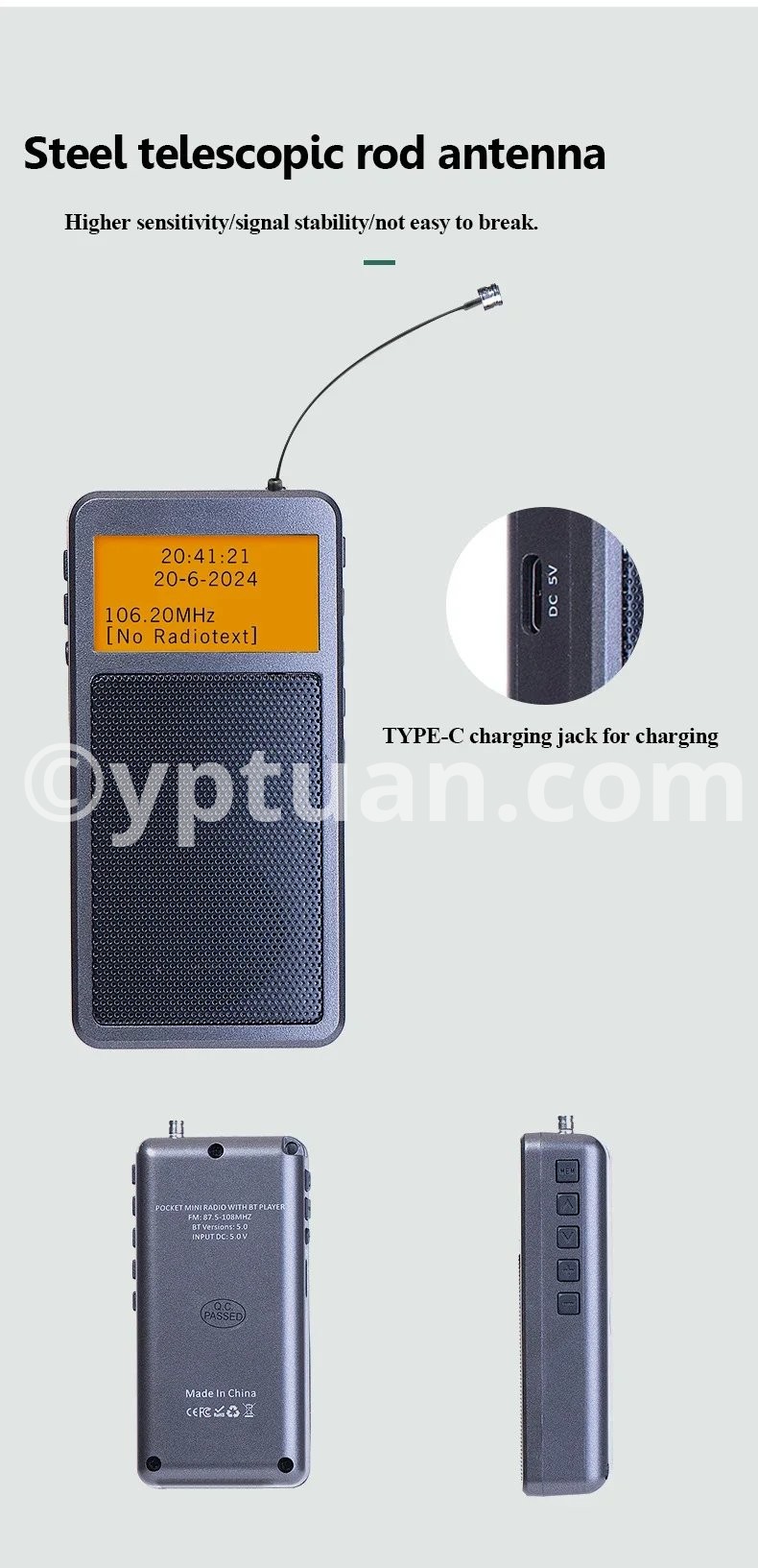 Three ways to search for stations Supports automatic station search, automatic station search, manual station search, easy to operate and use. Humanized Alarm The alarm clock can be turned on and set to 5 kinds of auto shut-off time: 90 minutes/60 minutes/45 minutes/30 minutes/15 minutes. Alarm time can be selected: 1 time only/ daily/ weekday/ weekend. Stereo sound Built-in chintie boron compound speakers, low distortion, smooth frequency response curve. Large capacity of receiver chip The number of stored stations can be up to 30, and has a shutdown memory function, manual storage, automatic scanning and storage of radio stations. Steel telescopic rod antenna Higher sensitivity/signal stability/not easy to break. Listen to radio with Bluetooth headset You can listen to news, current events, and sports lovers can also enjoy the radio news. Backlight design The backlight will light up every time you press the button, easy to use at night. Support wired headset listening No need to disturb others, you can use 3.5MM headphones to listen, more intimate! Parameter Specifications: FM frequency range: FM :87.5-108.0MHZ FM signal-to-noise ratio: 40DB Bluetooth version: V5.0 Receiving signal into Bluetooth signal receiving distance: ≤ 20 meters Number of FM storage stations: 30 Headphone output interface: standard 3.5MM Speaker: Diameter 40MM/4ohm/3W External power supply: DC5V Minimum working voltage: 3.4V Output power: 280MW Lithium battery: 3.7V 500mah Static current: 48UA Maximum current: 130MA Stereo separation: 26DB Product Size: 93X44.7X22.6MM Net weight: 75G