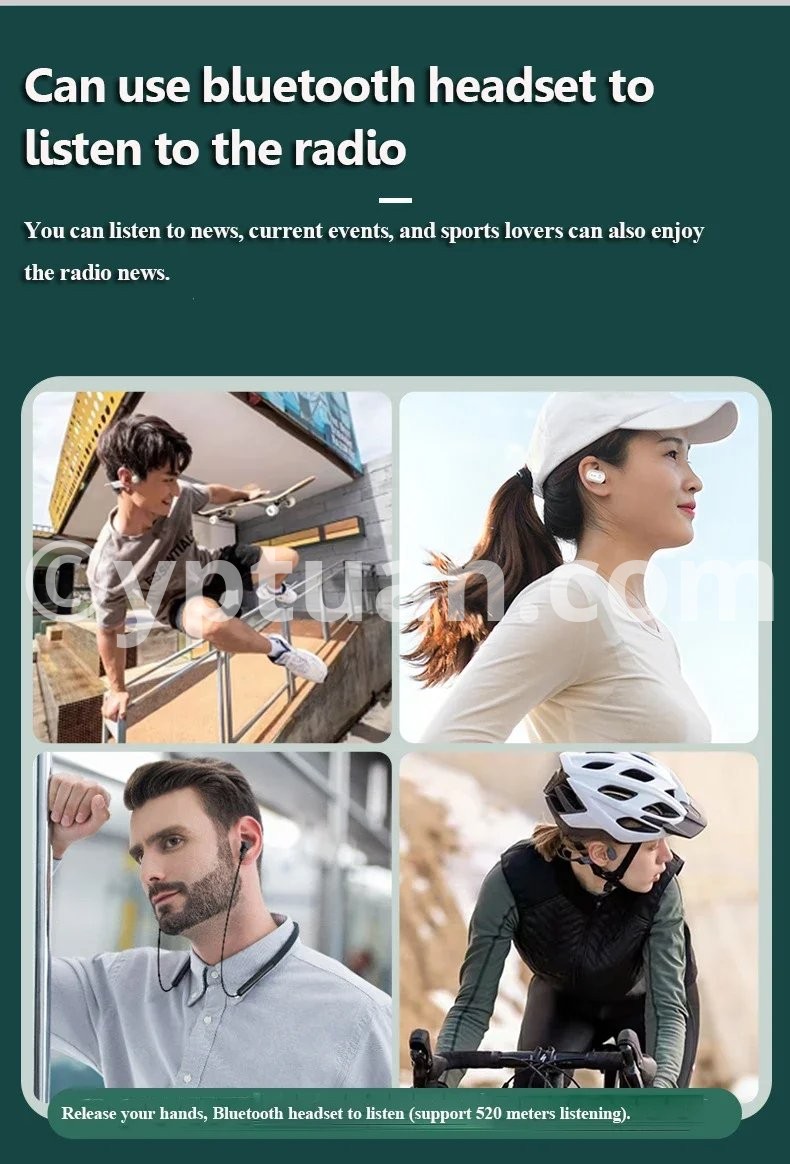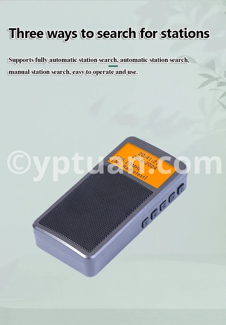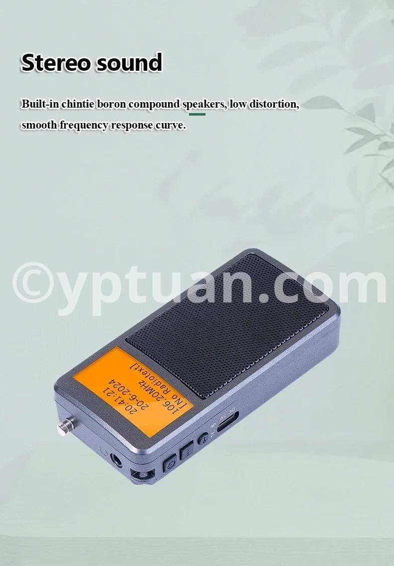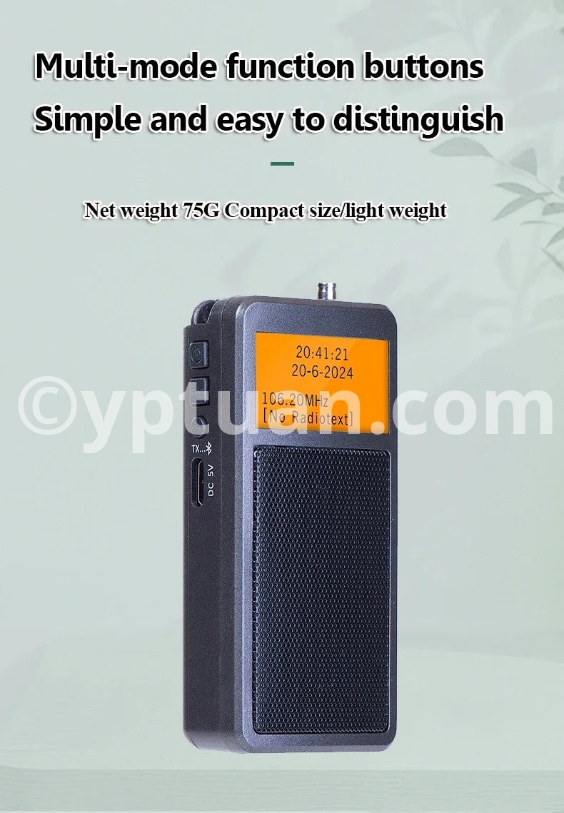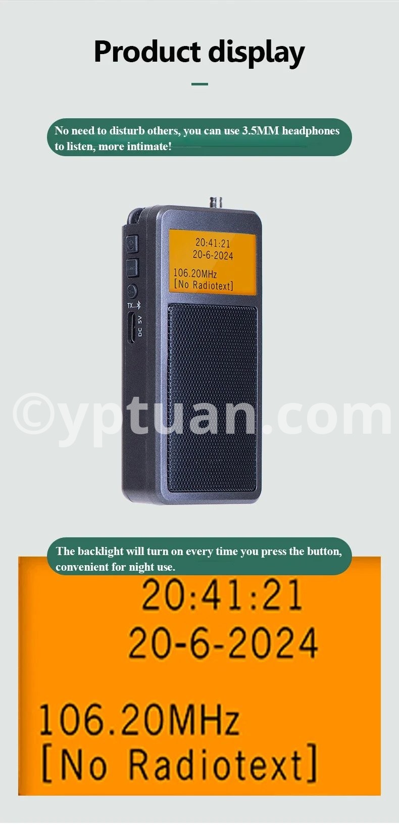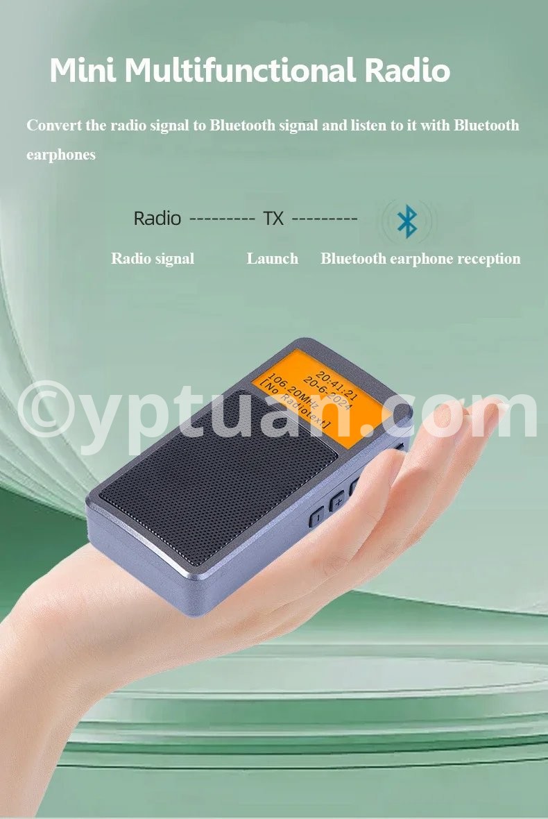 Three ways to search for stations Supports automatic station search, automatic station search, manual station search, easy to operate and use. Humanized Alarm The alarm clock can be turned on and set to 5 kinds of auto shut-off time: 90 minutes/60 minutes/45 minutes/30 minutes/15 minutes. Alarm time can be selected: 1 time only/ daily/ weekday/ weekend. Stereo sound Built-in chintie boron compound speakers, low distortion, smooth frequency response curve. Large capacity of receiver chip The number of stored stations can be up to 30, and has a shutdown memory function, manual storage, automatic scanning and storage of radio stations. Steel telescopic rod antenna Higher sensitivity/signal stability/not easy to break. Listen to radio with Bluetooth headset You can listen to news, current events, and sports lovers can also enjoy the radio news. Backlight design The backlight will light up every time you press the button, easy to use at night. Support wired headset listening No need to disturb others, you can use 3.5MM headphones to listen, more intimate! Parameter Specifications: FM frequency range: FM :87.5-108.0MHZ FM signal-to-noise ratio: 40DB Bluetooth version: V5.0 Receiving signal into Bluetooth signal receiving distance: ≤ 20 meters Number of FM storage stations: 30 Headphone output interface: standard 3.5MM Speaker: Diameter 40MM/4ohm/3W External power supply: DC5V Minimum working voltage: 3.4V Output power: 280MW Lithium battery: 3.7V 500mah Static current: 48UA Maximum current: 130MA Stereo separation: 26DB Product Size: 93X44.7X22.6MM Net weight: 75G