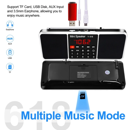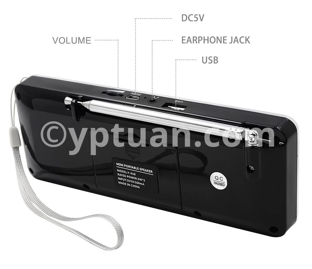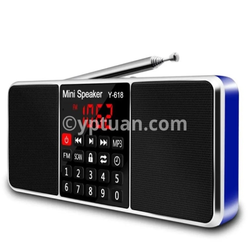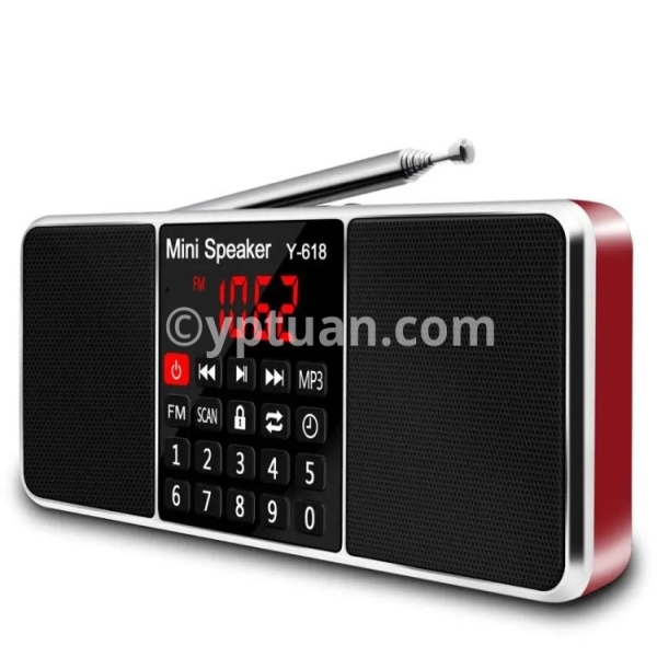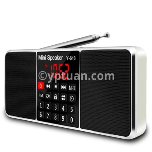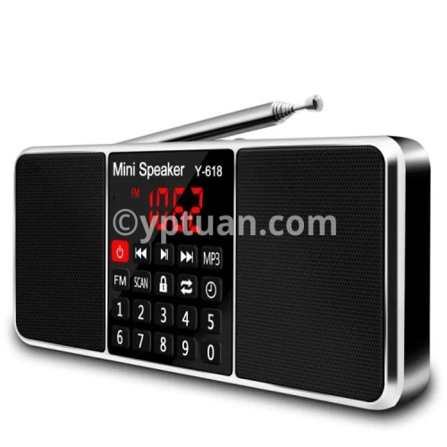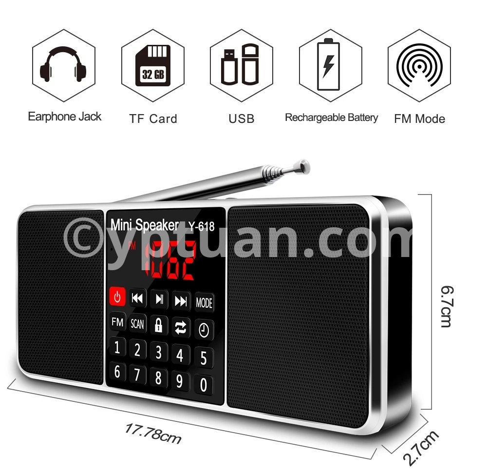 Y-618 radio combines with the FM radio frequency and speaker features, MP3 player, support the TF Card, USB drive, AUX audio input and 3.5mm earphone .
