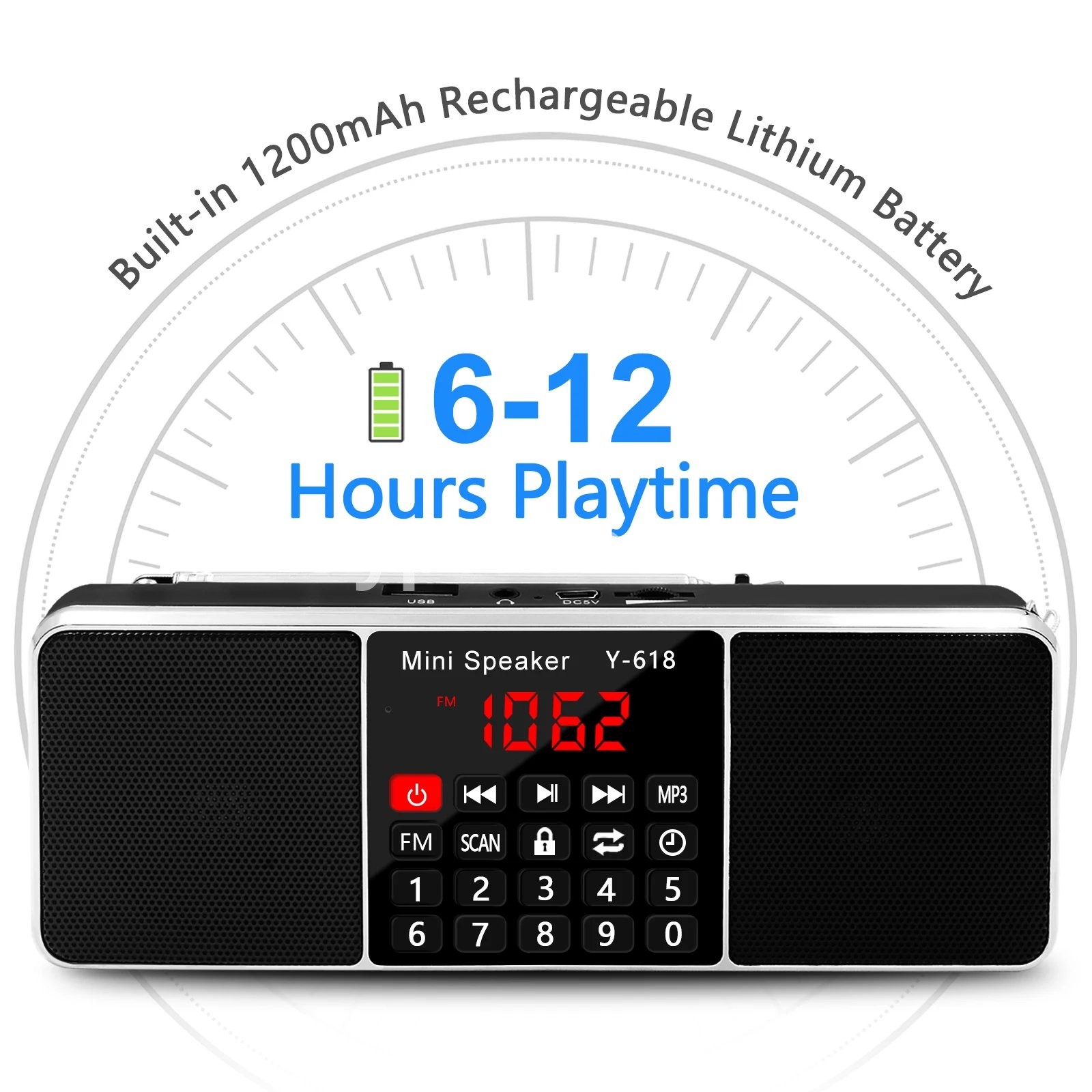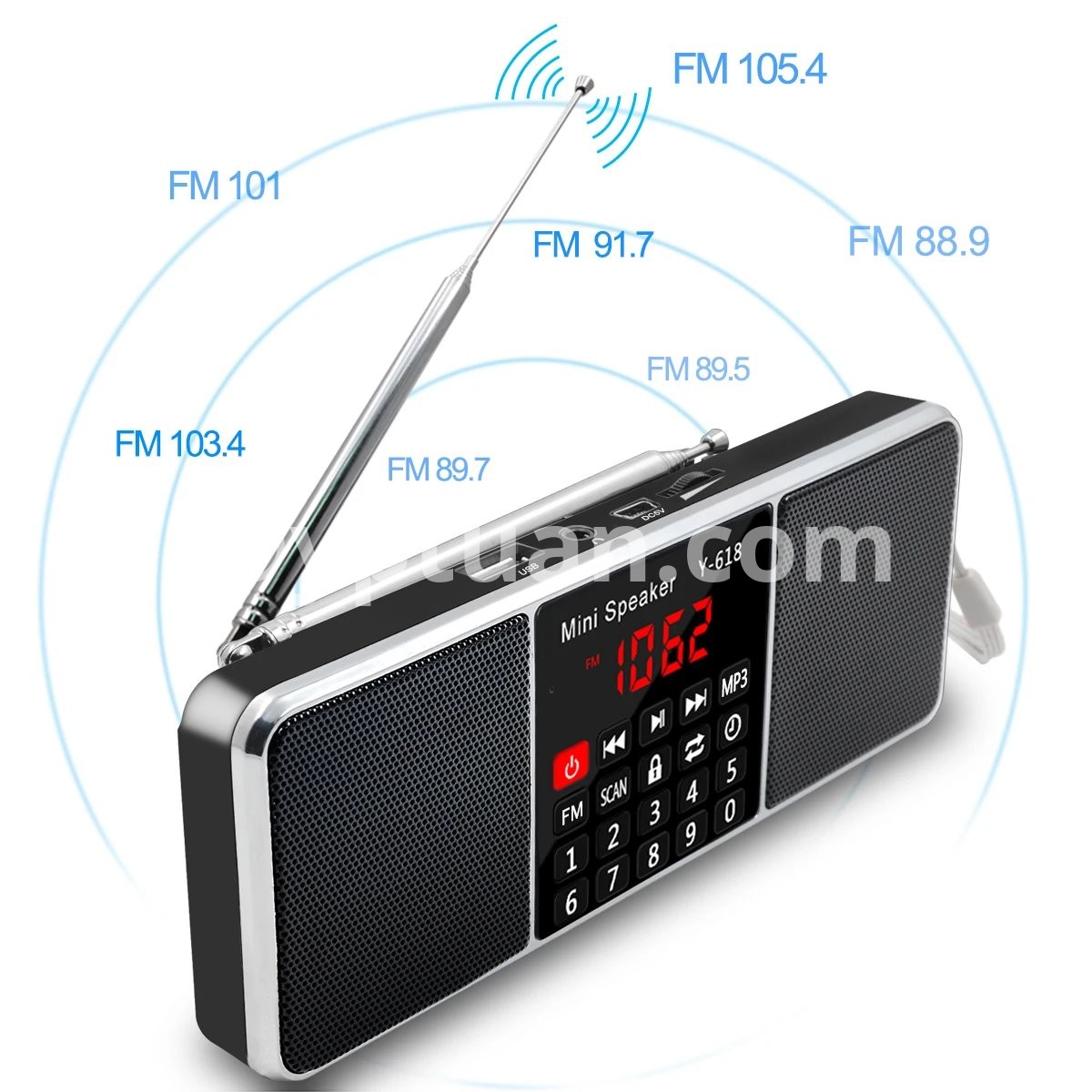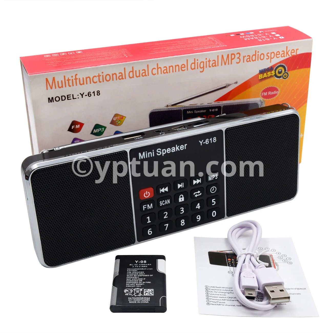 Y-618 radio combines with the FM radio frequency and speaker features, MP3 player, support the TF Card, USB drive, AUX audio input and 3.5mm earphone .