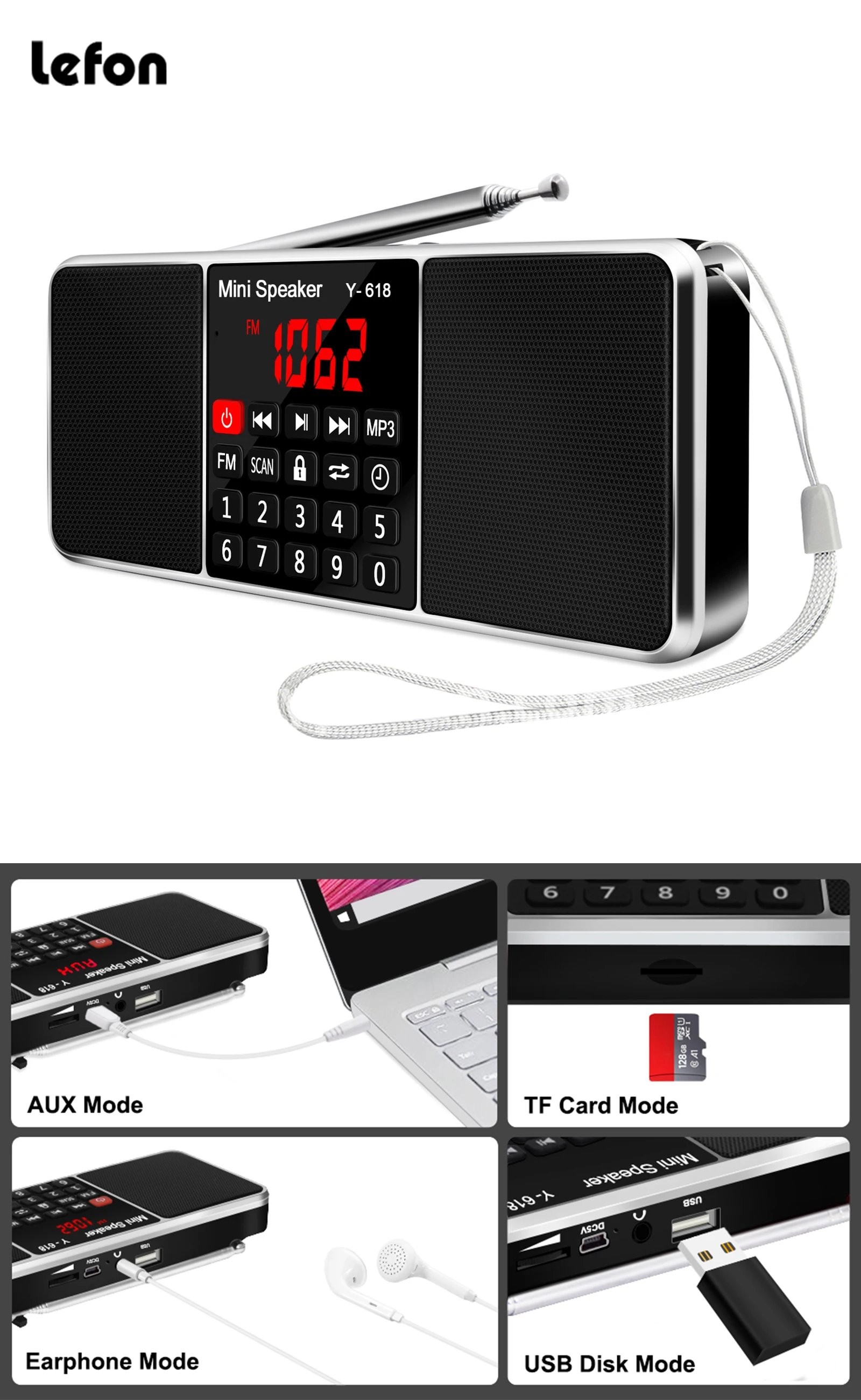 Lefon Digital FM Radio Receiver Speaker MP3 Player Support TF Card USB Drive AUX LED Screen Display Time Shutdown Rechargeable Portable Radios