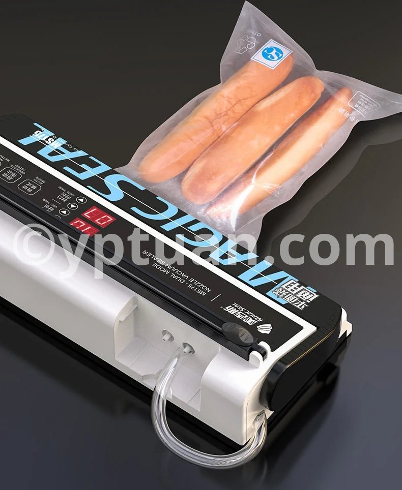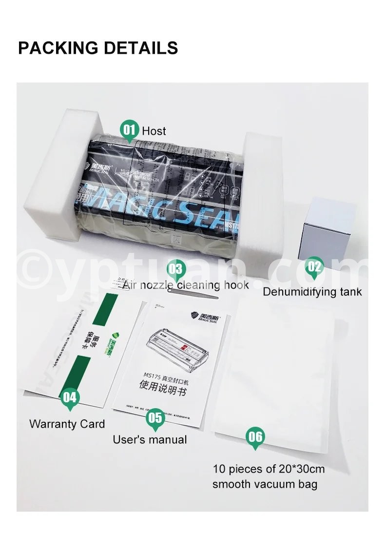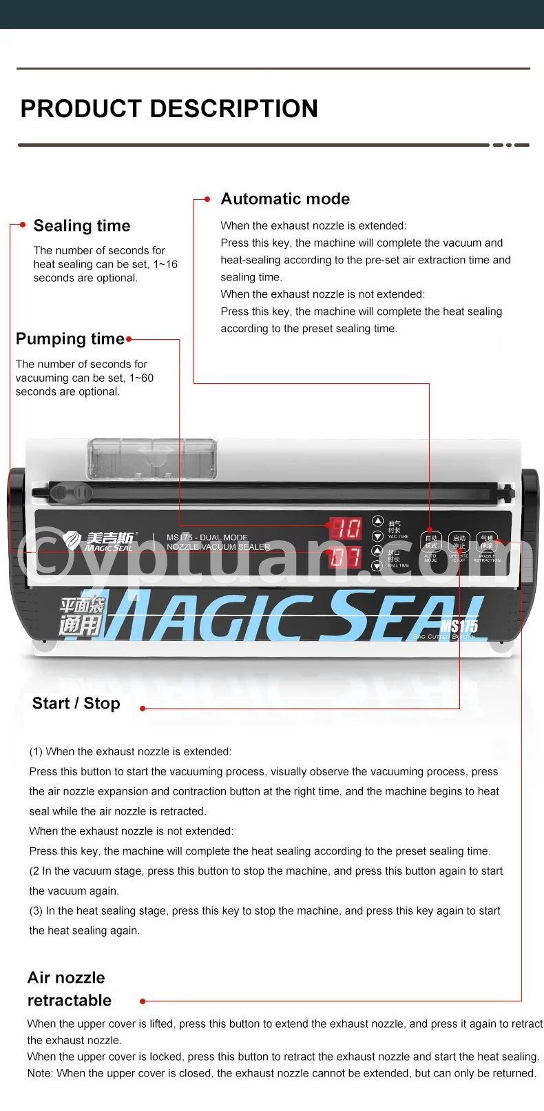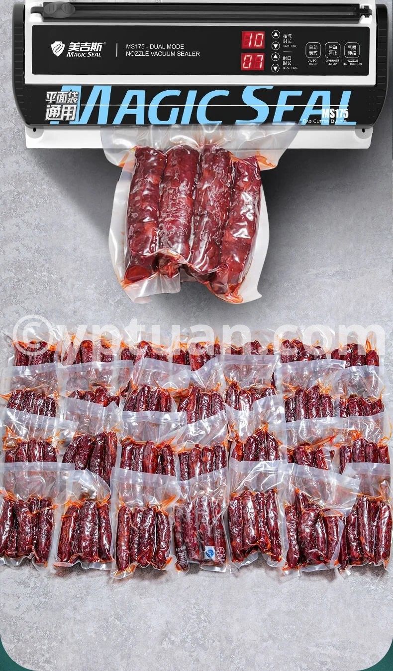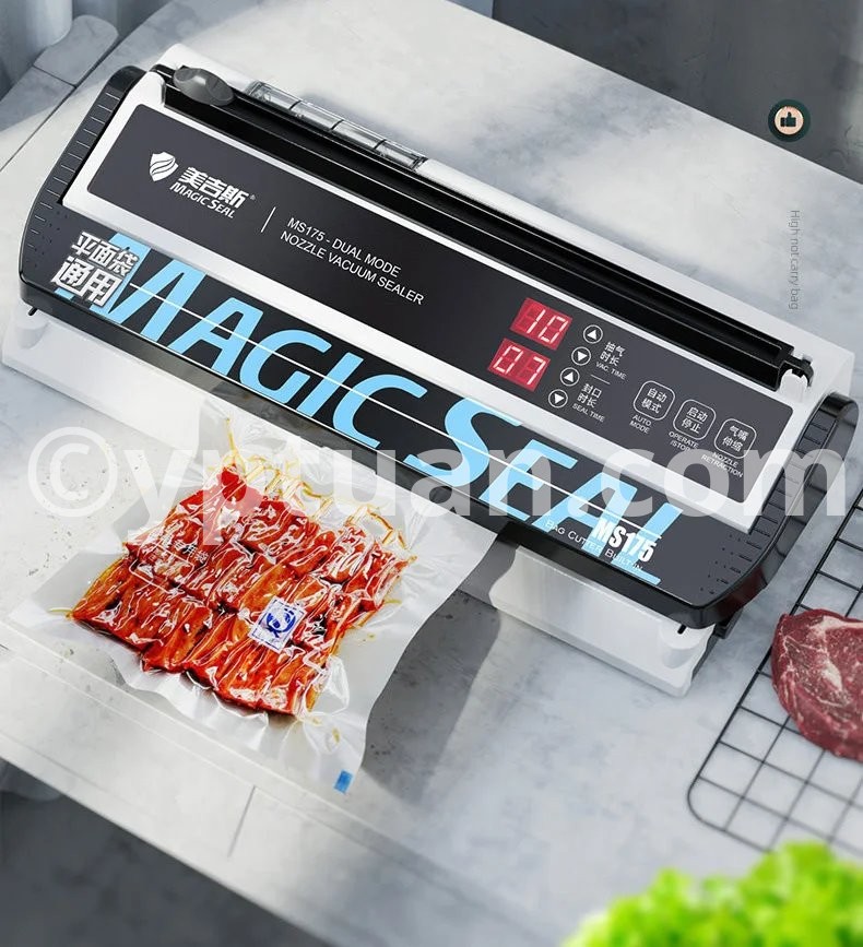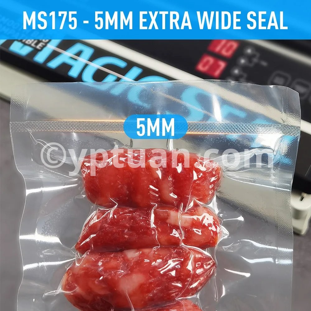 *At present, the 8mm wide sealing line of MAGIC SEAL MS175 has been changed to 5mm. To reduce the heating burden of electric heating wires.Please be informed. 1.MS175 vacuum sealing machine is applicable to smooth surface vacuum bags. Advantages of smooth bag: low cost, various forms. 2.The sealing strip will heat up when vacuuming, please do not touch it during use to avoid burns.