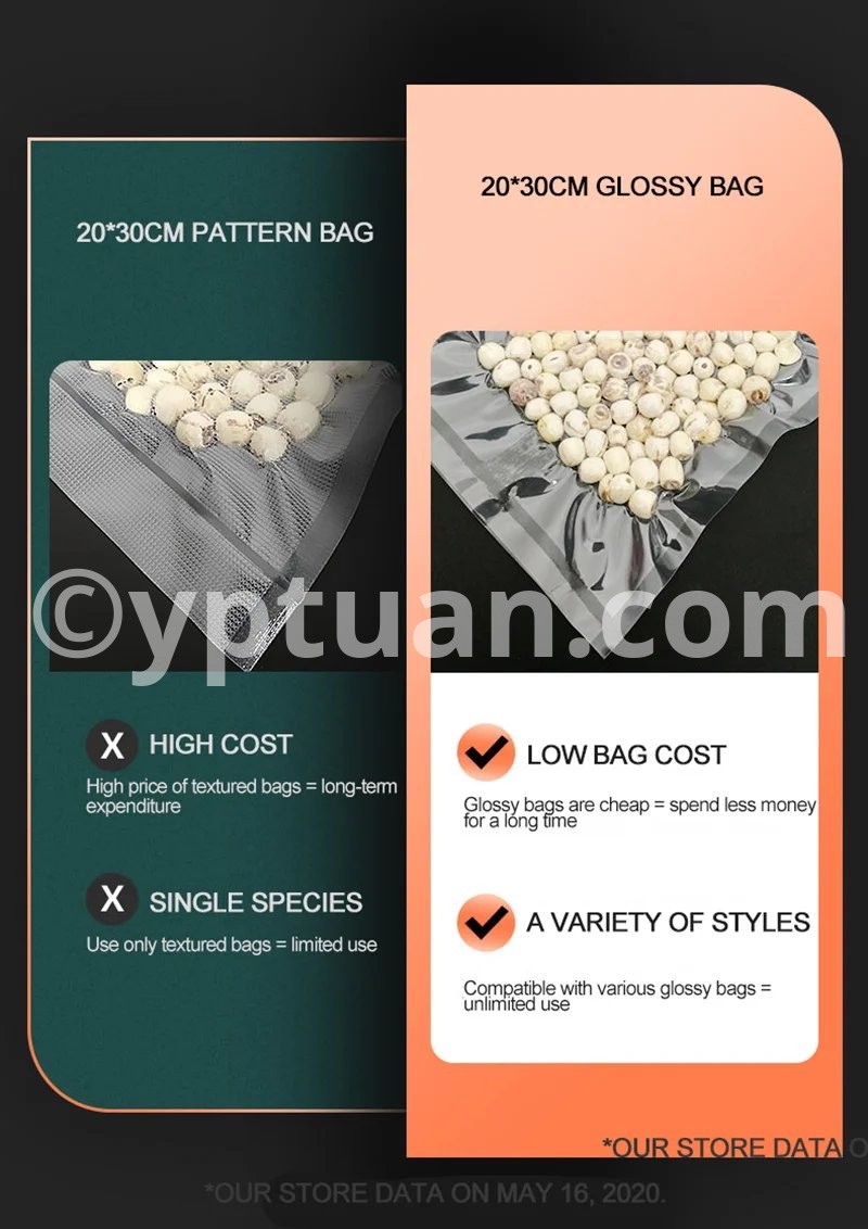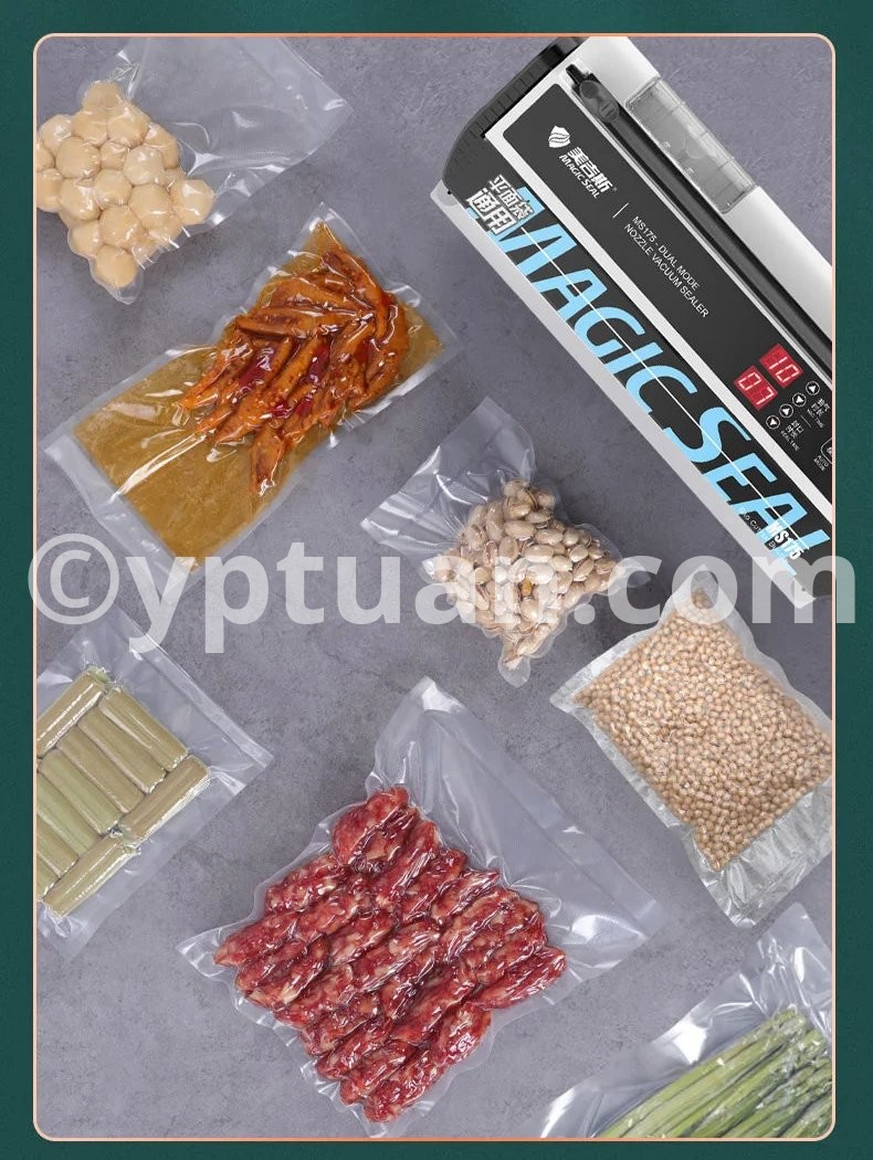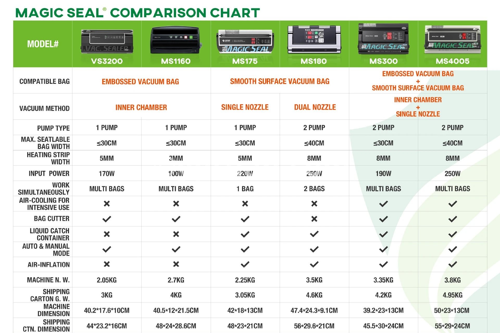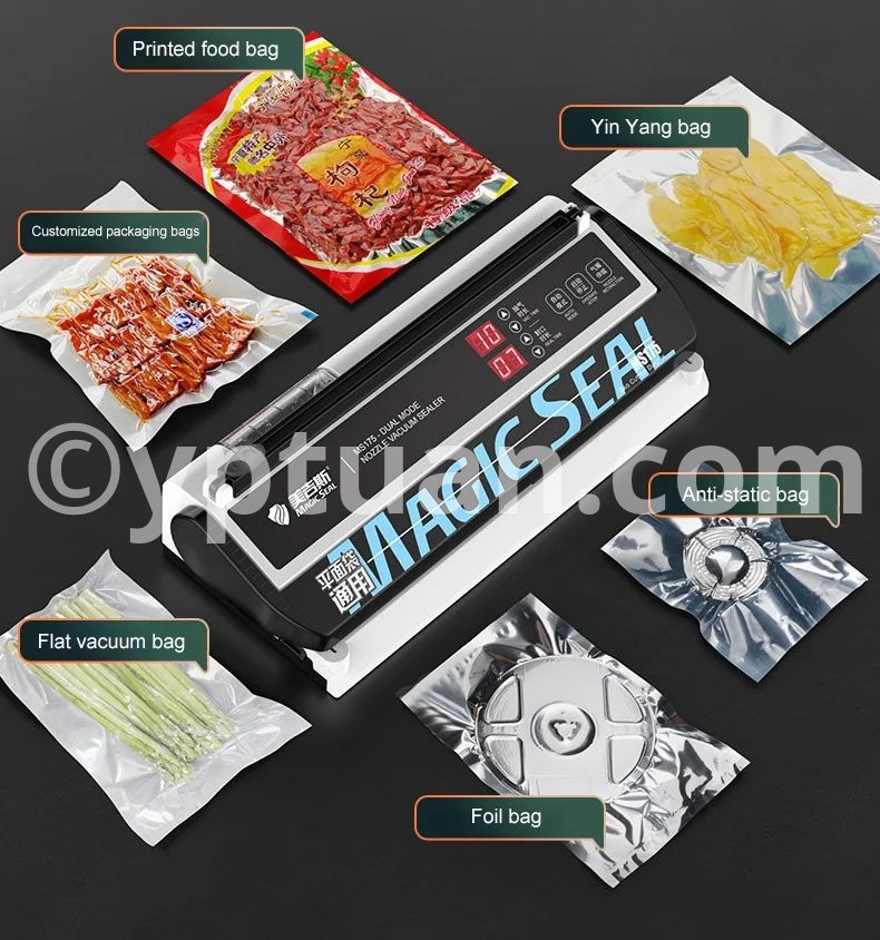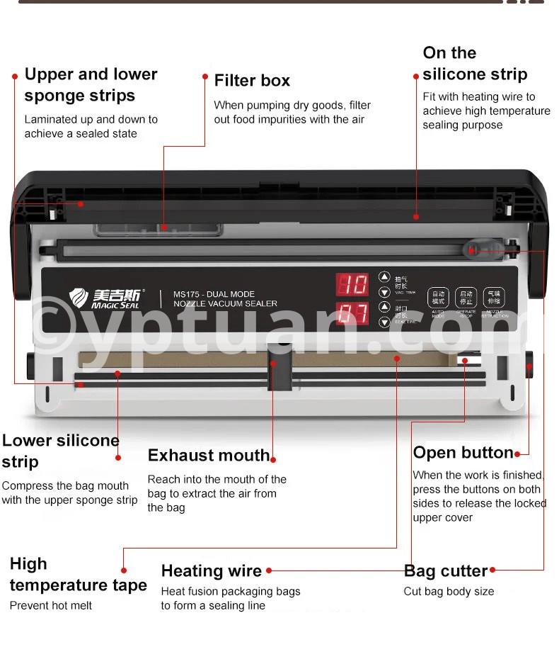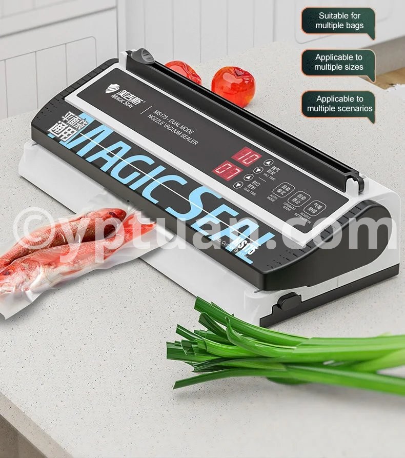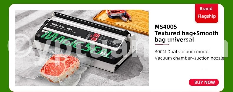 *At present, the 8mm wide sealing line of MAGIC SEAL MS175 has been changed to 5mm. To reduce the heating burden of electric heating wires.Please be informed. 1.MS175 vacuum sealing machine is applicable to smooth surface vacuum bags. Advantages of smooth bag: low cost, various forms. 2.The sealing strip will heat up when vacuuming, please do not touch it during use to avoid burns.