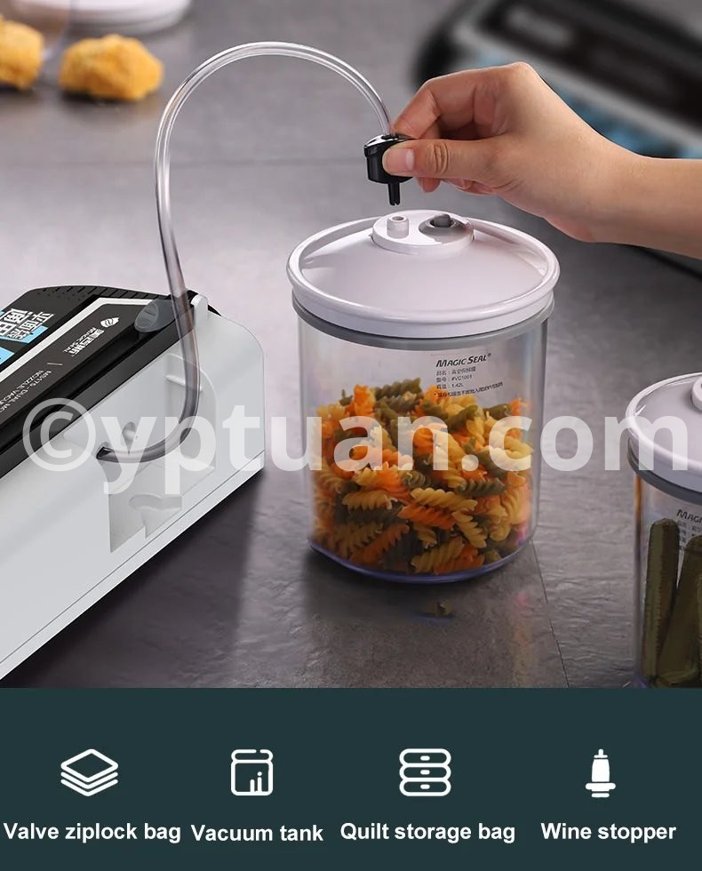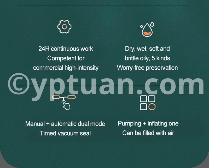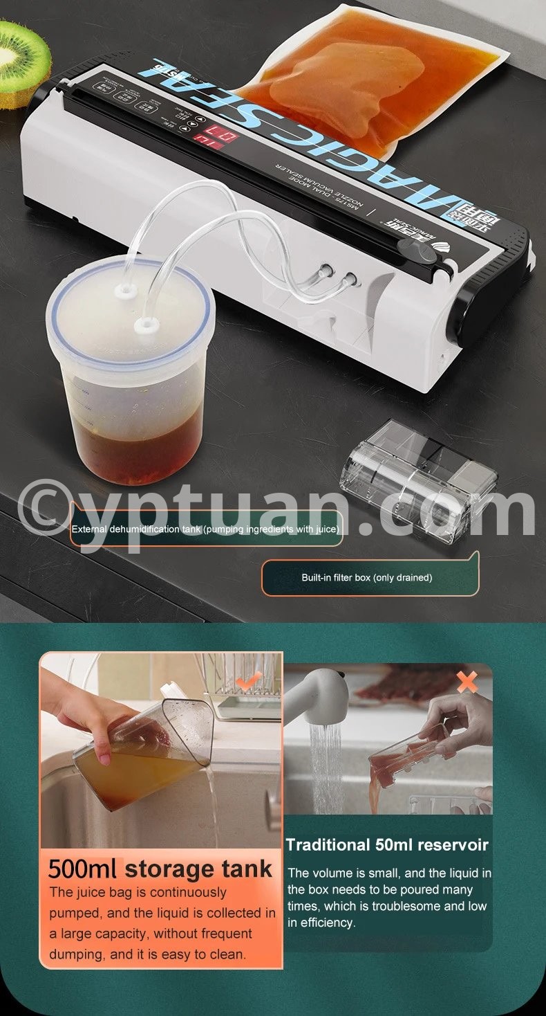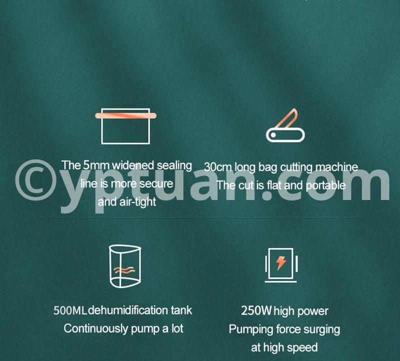 *5mm widened sealing line, firm and airtight. *Equipped with a 30cm long pocket knife, which is convenient and has a flush cut. *Equipped with an 800 ml dehumidifying tank, which can continuously pump a large amount of juice. *250W high power, fast surging power. *24H continuous work, suitable for high-intensity commercial use. *Dry, wet, soft and crispy oil - 5 types of food, fresh and worry-free. *Manual + automatic dual mode, full time vacuum sealing. *Pumping + inflation in one, can be filled with air.