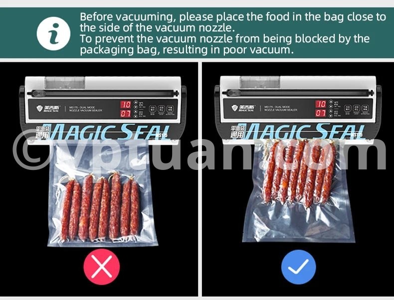 перед вакуумом, пожалуйста, подойдите пища ближе к стороне насоса. во избежание того, чтобы упаковочный мешок затыкал вакуумный насос, из - за чего он плохо накачивается.