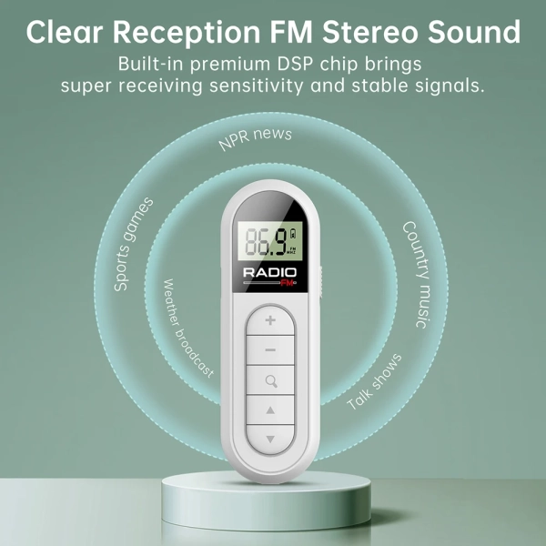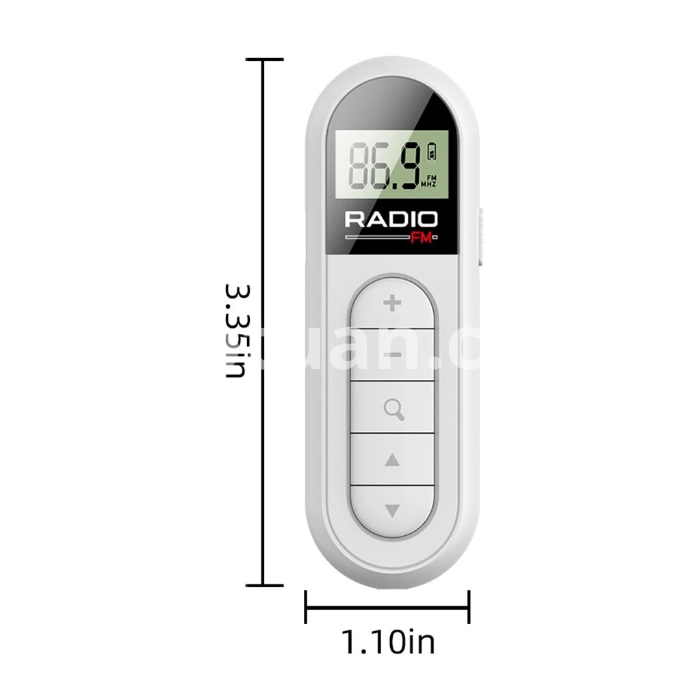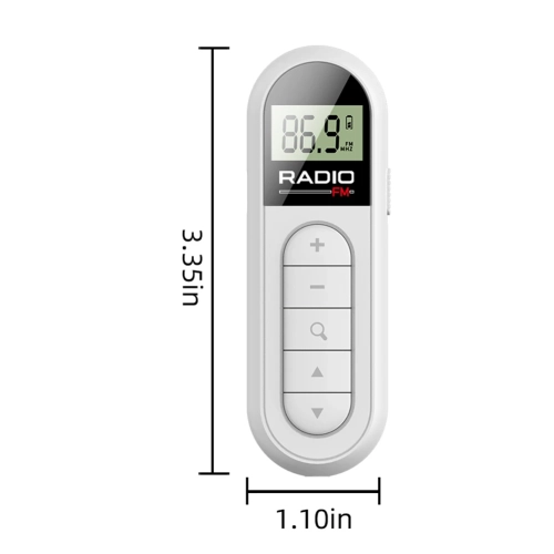 FM Radio Backlight LCD Display Mini Pocket Clip Radio with 3.5mm Headphones Personal Walkman Radio Type-c Charging 76-108MHZ for Walk Jogging Camping Feature: 1. Mini and Portable: With dimensions of 3.35x1.1x0.75 inches, this FM radio is as small as a lipstick, making it ultra-lightweight and easily portable. It occupies minimal space and adds no extra weight to your bag or pocket. 2. Hands-Free Clip Design: Free up your hands with the convenient pocket clip design of mini pocket clip radio . With just one hand, you can effortlessly operate the radio while engaging in activities like sports, running, sightseeing, or delivering presentations at meetings. 3. FM Frequency Radio: Tune in to a wide range of frequencies from 76 to 108 MHz, ensuring stable reception and providing you with up-to-date news. Equipped with an advanced DSP filtering chip, this portable radio offers exceptional reception sensitivity. For listening to radio programs, simply insert the 3.5mm headphone, as the headphone wire serves as an FM antenna. 4. Long-lasting Battery Life: Despite its mini size, this stereo radio features a built-in 300mAh rechargeable battery, offering a longer playback time of 10-15 hours. The Type-C charging interface and low power consumption circuit design further enhance its durability. 5. Real-Time LCD Display: Designed for easy nighttime use, this personal walkman radio comes with an LCD display screen. The soft orange backlight provides a gentle and intelligent illumination, allowing for clear and precise navigation of search and audio storage functions. The user-friendly interface and simple operation make it especially suitable for elderly individuals. Accessing your favorite functions is as easy as pressing a single button. Specification: Certification: CE Origin: Mainland China Function: Built-In Speaker Type: FM Style: Portable Power Supply: Rechargeable Battery Pack Screen: Yes Package: Yes Color: White Frequency range: FM: 76-108 MHZ Sensitivity: FM: 8Uv Signal to noise ratio: FM: ≥ 40DB Maximum output power: 6.5MW Lithium battery: 300mah 3.7v External power supply: DC 5V Charging interface: Type-C Minimum working voltage: 3.3 V Maximum current: 40MA Stereo separation: 26DB External earplugs: diameter 3.5MM/32ohm * 2 Certification: CE/FCC Size: 85 * 28 * 19mm/3.35x1.1x0.75inch Net weight: 35g Power on/off: Turn the right switch to turn the radio on and off. Reminder: This product has a built-in lithium battery. Please fully charge the product before use for the first time Method of receiving broadcasts: This product supports three channel selection methods: manual channel selection, semi-automatic station search, and fully automatic scanning station search (for listening to radio programs, please plug in 3.5mm headphones. The headphone cable is an FM FM receiving antenna.) TYPE-C USB charging: The radio uses the TYPE-C charging interface. When the radio's battery symbol is flashing, please connect an external DC5V power supply to charge the radio (it can be charged when turned off or on). When charging, the battery symbol is flashing, and when fully charged, the LCD charging indicator character stops flashing. After fully charging, please unplug the external power supply. It is recommended to use a charging device with an output voltage of DC5V/1A-2A for charging to avoid damage to the lithium battery or equipment Note: Due to the different monitor and light effect, the actual color of the item might be slightly different from the color showed on the pictures. Thank you! Please allow 1-2cm measuring deviation due to manual measurement.