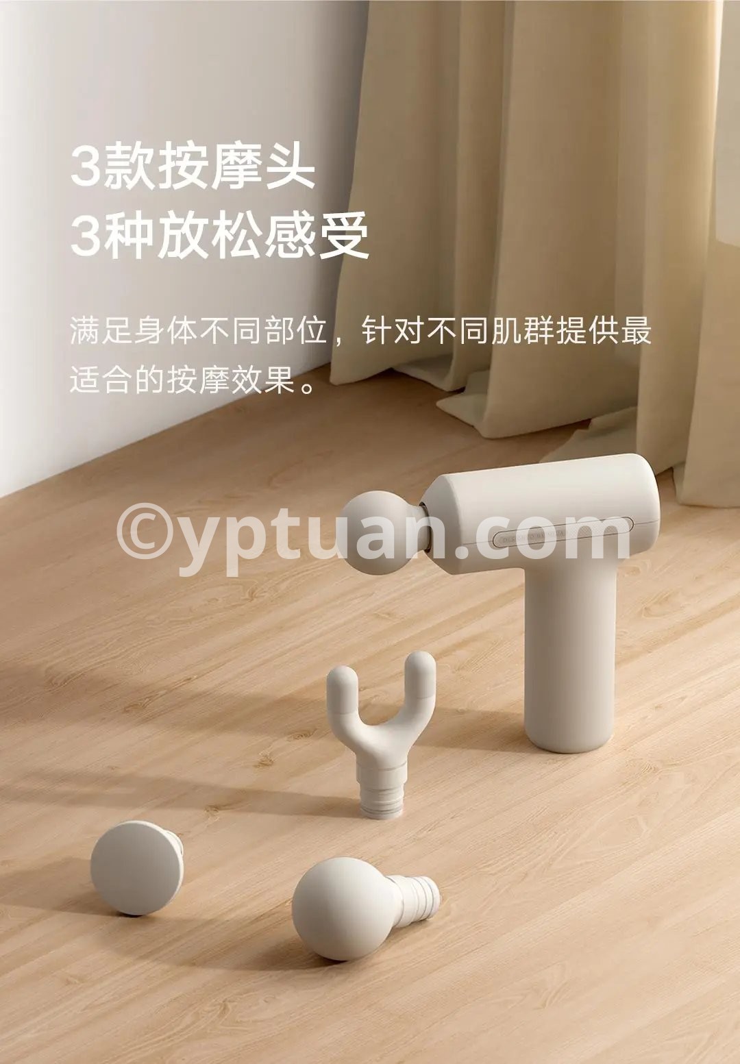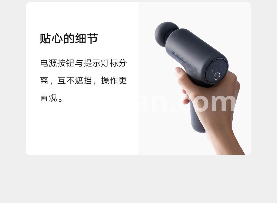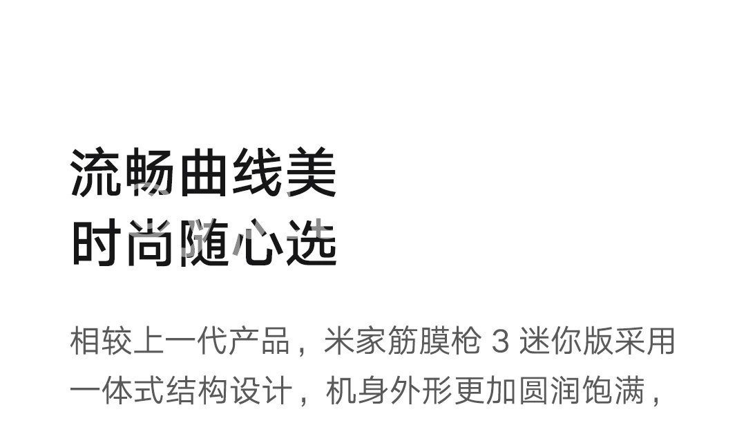 Xiaomi Mijia Fascia Gun 3 mini Product parameters Product Name: Mi Home Fascia Gun 3 Mini Version Product size: 106 × 46×138mm Product Model: MJJMQ07YM Net weight of the product: approximately 357g Charging interface: Type-C Battery type: Lithium battery Battery capacity: 1900mAh Rated input: 5V=2A Operating temperature: 5℃ to 40℃ Packaging list Foam roller gun body ×1 Flat head ×1 U-shaped head ×1 Spherical head ×1 Chinese Instruction Manual x1 Type-C charging cable x1 Product Features 1* Dual-frequency mode: fixed-frequency exercise mode, variable-frequency massage mode 2*12KG thrust, depth mode muscle 3* Intelligent gear level memory, 3 massage modes It weighs 4*357g and is portable The noise is as low as 40dB 6* Gray indicator light: Off, with a relatively low intensity White indicator light: The white light remains on for a long time with an appropriate intensity Orange indicator light: The orange light is on at the same length and the intensity is too high 7*3 massage heads 8* Hidden heat dissipation to prevent sweat from entering 9*1900mAh large-capacity lithium battery 10*Type-C charging