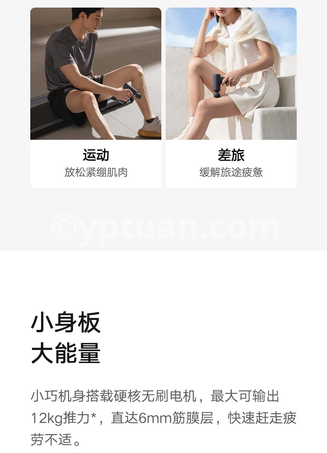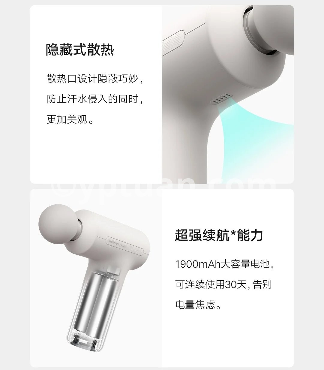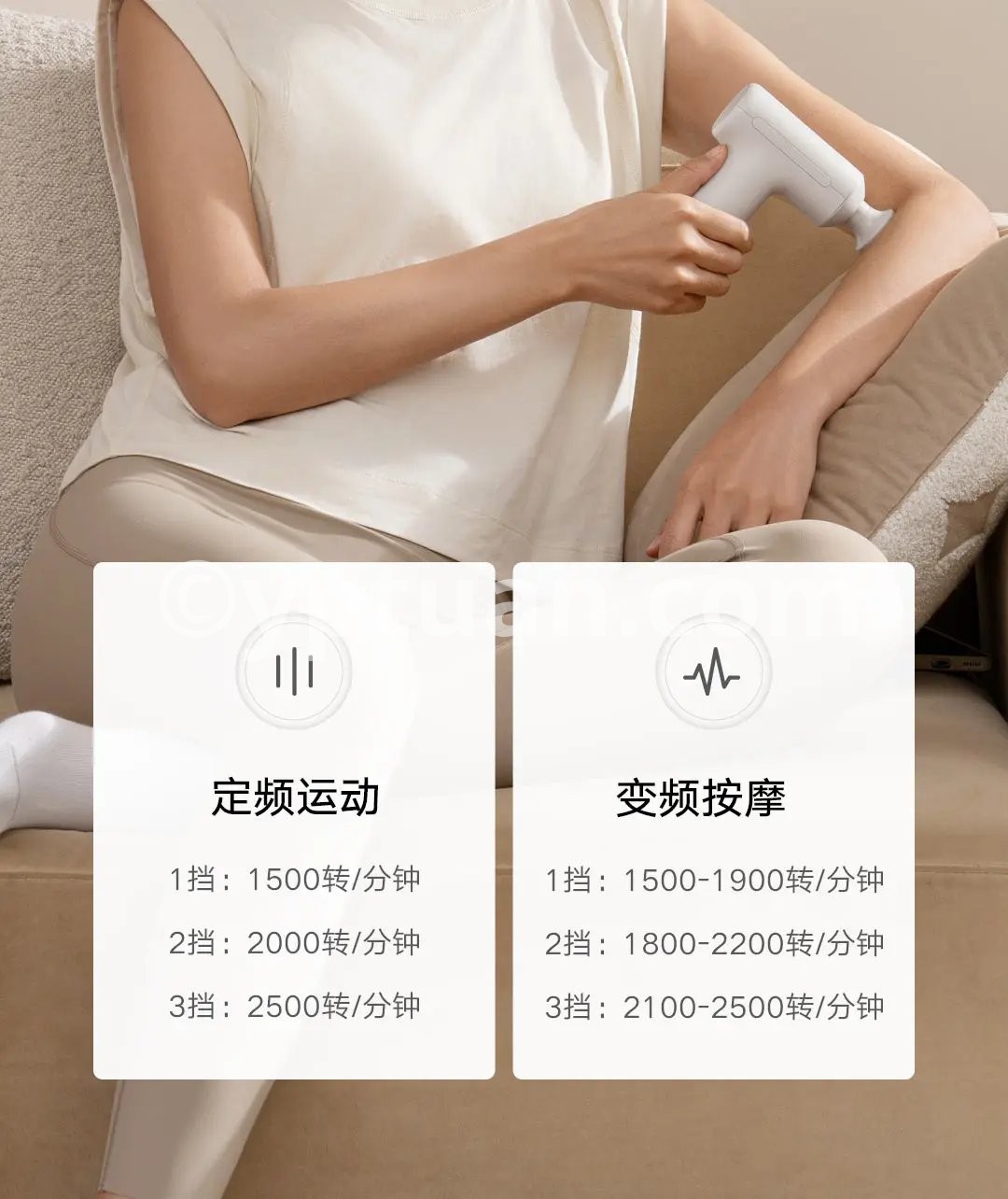 Xiaomi Mijia Fascia Gun 3 mini Product parameters Product Name: Mi Home Fascia Gun 3 Mini Version Product size: 106 × 46×138mm Product Model: MJJMQ07YM Net weight of the product: approximately 357g Charging interface: Type-C Battery type: Lithium battery Battery capacity: 1900mAh Rated input: 5V=2A Operating temperature: 5℃ to 40℃ Packaging list Foam roller gun body ×1 Flat head ×1 U-shaped head ×1 Spherical head ×1 Chinese Instruction Manual x1 Type-C charging cable x1 Product Features 1* Dual-frequency mode: fixed-frequency exercise mode, variable-frequency massage mode 2*12KG thrust, depth mode muscle 3* Intelligent gear level memory, 3 massage modes It weighs 4*357g and is portable The noise is as low as 40dB 6* Gray indicator light: Off, with a relatively low intensity White indicator light: The white light remains on for a long time with an appropriate intensity Orange indicator light: The orange light is on at the same length and the intensity is too high 7*3 massage heads 8* Hidden heat dissipation to prevent sweat from entering 9*1900mAh large-capacity lithium battery 10*Type-C charging