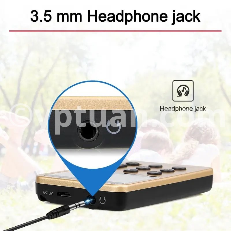4.3.5 mm Headphone jack:portable radio without external speakers.When receiving the radio stations, please extend the earphone cable as far as possible for better effect. This pocket radio does not have the speaker, you must wear the headset to listen; this portable radio can work with any other 3.5mm earphone.