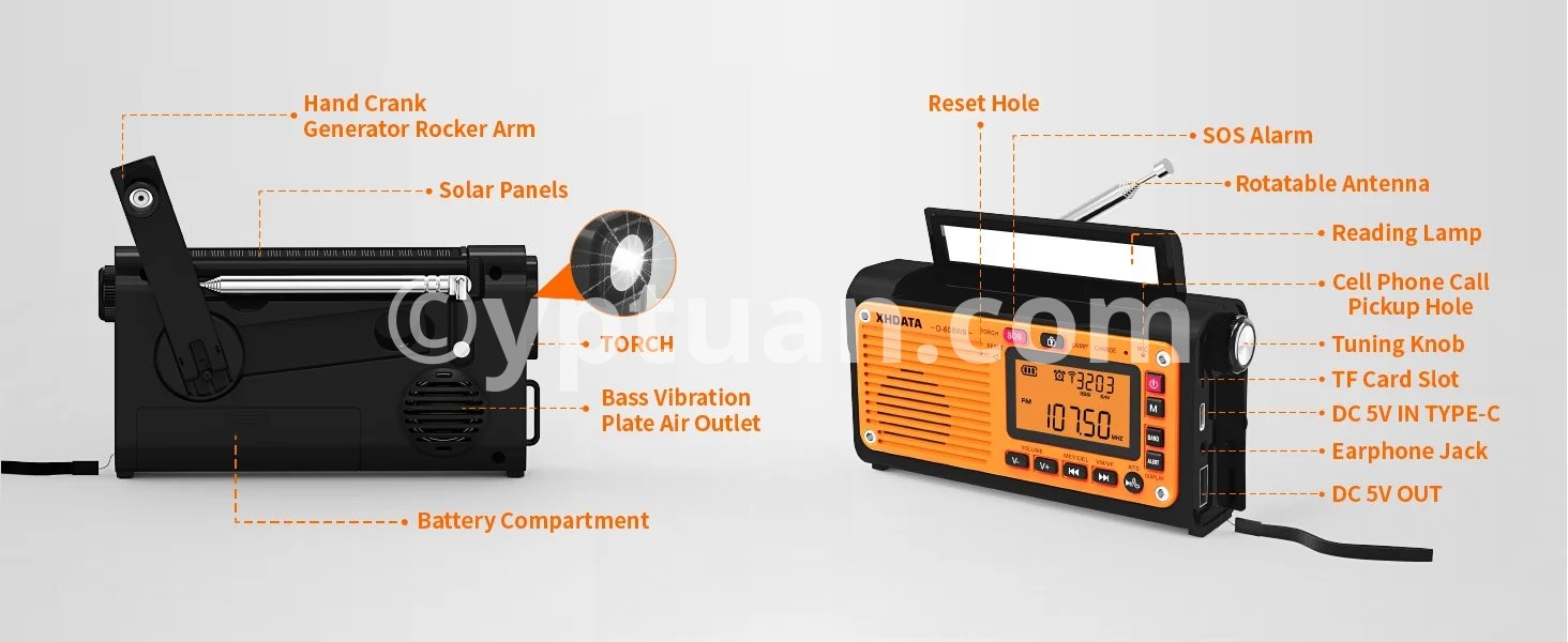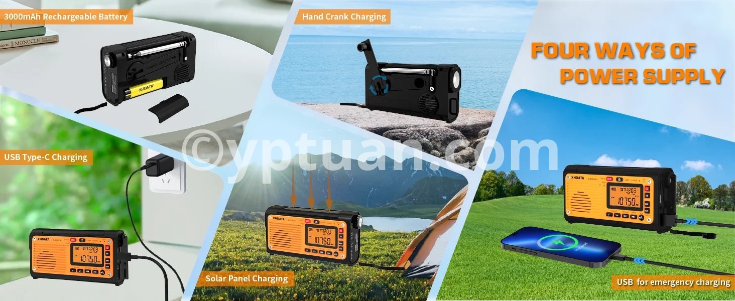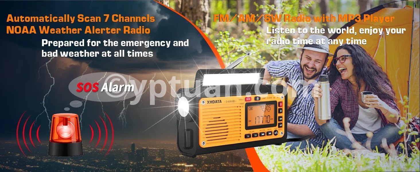 [4 WAYS POWER SUPPLY AND POWER BANK]-3000mAh Rechargeable battery operated hand crank radio, TYPE-C AC power supply, solar panel, hand-crank Charging, powerful and reliable emergency radio with 4 power supply options for home, indoor, outdoor, traveling or power outage emergencies, provides you with instant weather alerts automatically around the clock. D608WB can also be used as a power bank to charge your cell phone, with D608WB you don't have to worry about the trouble caused by a dead phone when you are traveling.