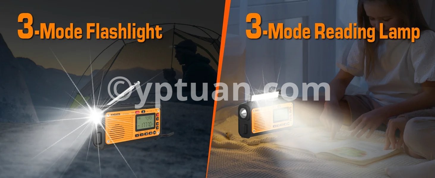 [FLASHLIGHT, READING LIGHTS AND SOS ALARM]-When natural disasters such as tornadoes, earthquakes, tsunamis occur, D608WB emergency weather radio with NOAA auto-scan will work with SOS alerts to remind you to tune in to the NOAA channel for the latest news. A built-in flashlight and reading light with three adjustable brightness levels will be useful in power outage. The SOS Alert helps you to call for help from your surroundings when you are in danger.