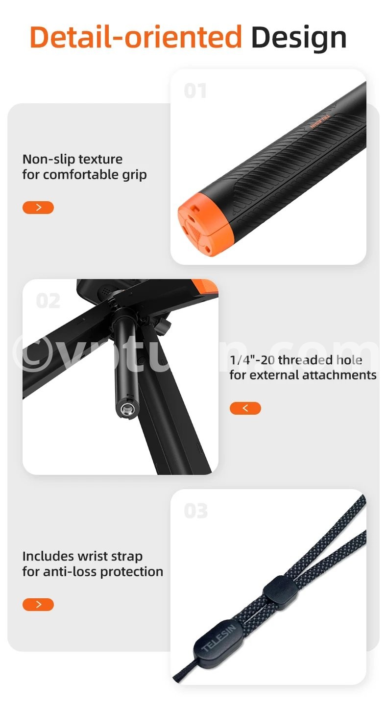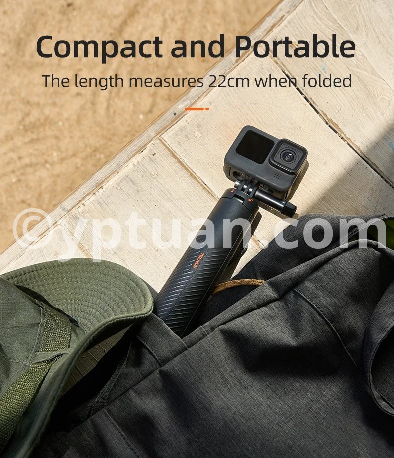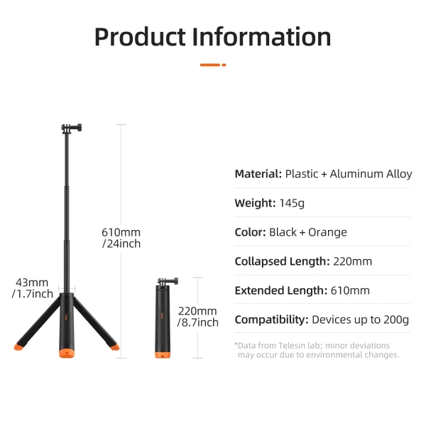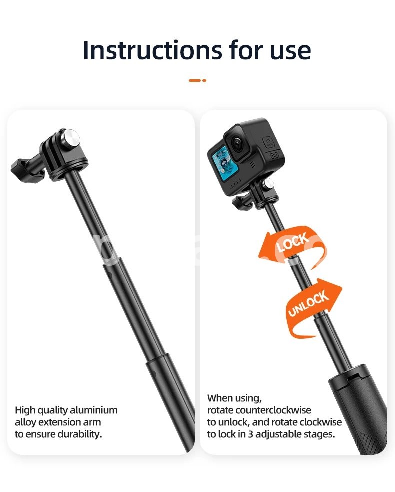 The aluminum alloy pole extends up to 61cm for use asa selfie stick.