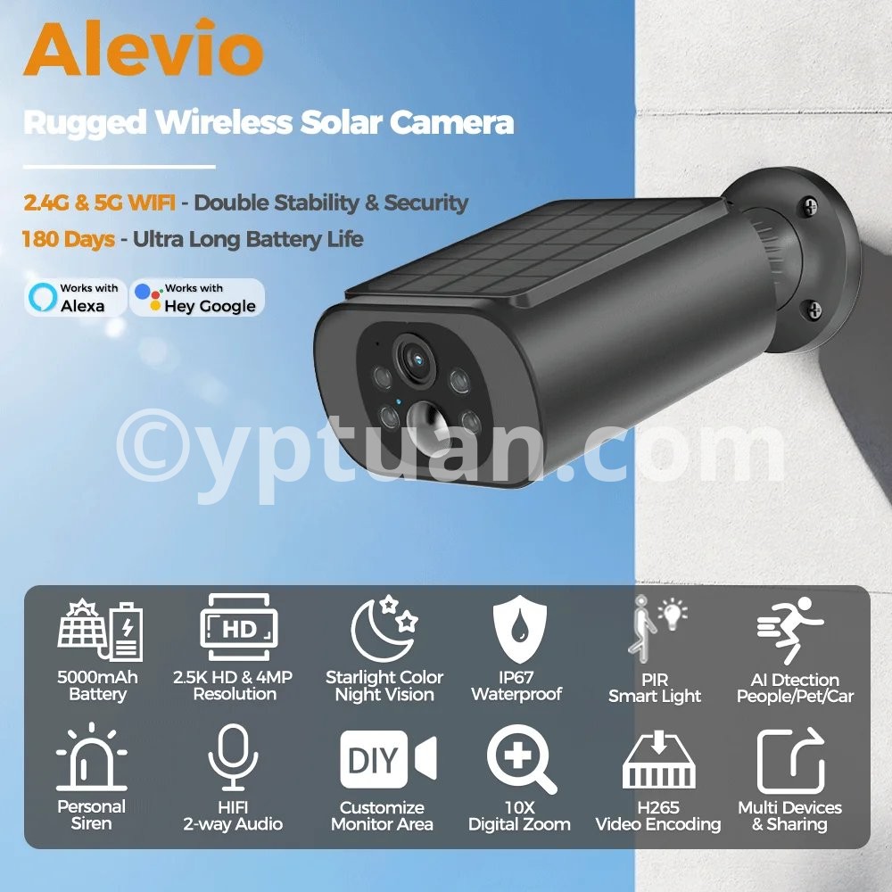 ALEVIO 2.5K/4MP Outdoor Wireless Camera WIFI,IP67 Waterproof Solar Camera with Ultra Standby Time/PIR Smart Light/Color Night Vision/2-Way Talk/Human/Car/Pet/Motion Detection/DIY Siren,IP Surveillance Camera for Indoor/Outdoor,Support Insert Micro SD Card,Works with Alexa & Google,2.4G/5Ghz WIFI,Connected via Bluetooth