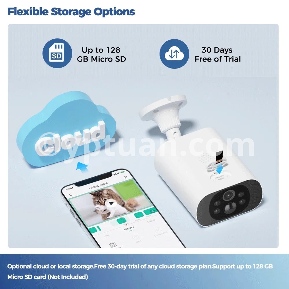 Optional cloud or local storage.Free 30-day trial of any cloud storage plan.Support up to 128 GB Micro SD card (Not Included)