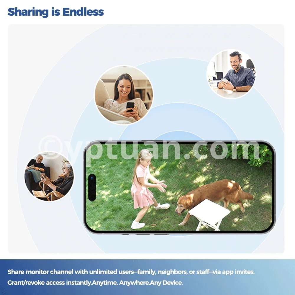 Share monitor channel with unlimited users—family, neighbors, or staff—via app invites. Grant/revoke access instantly.Anytime, Anywhere,Any Device.