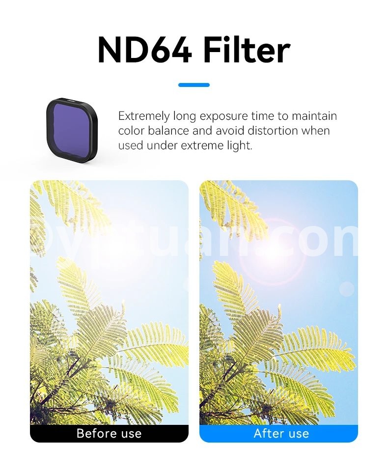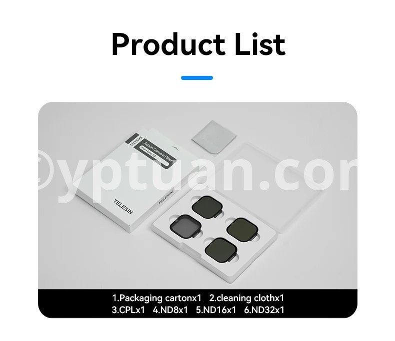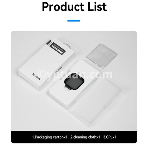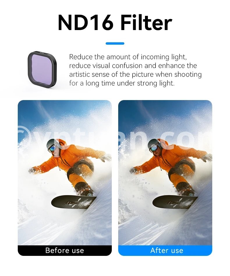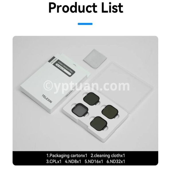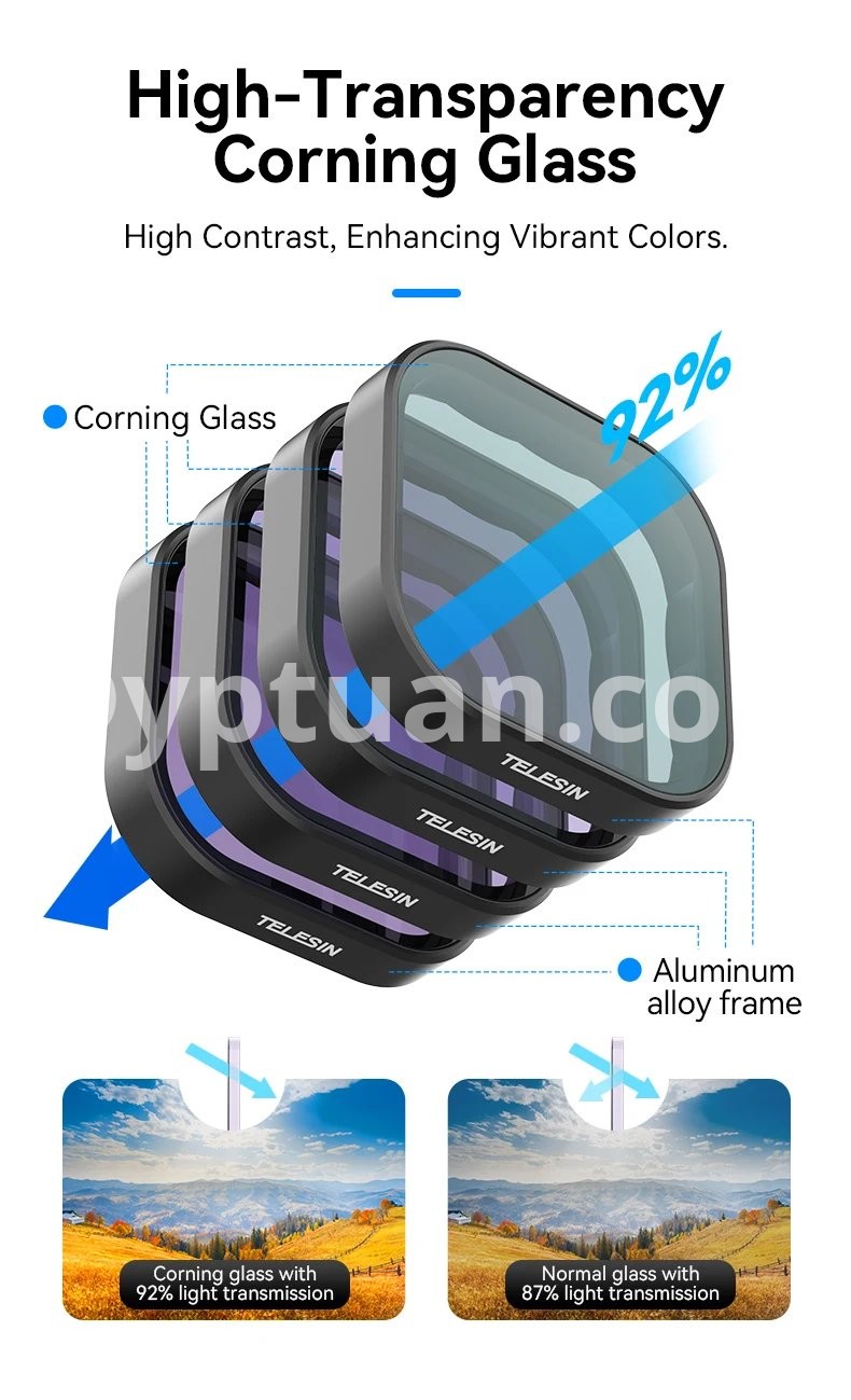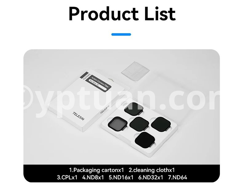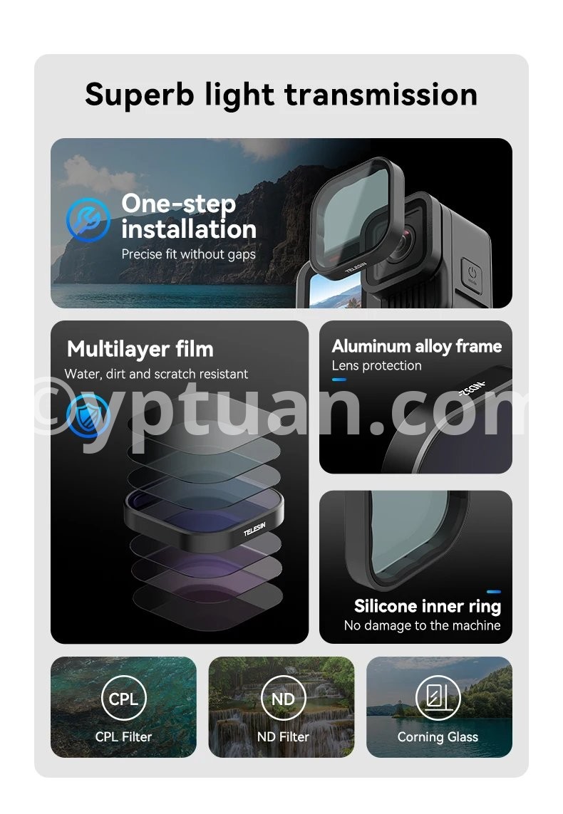 【High Light Transmittance for Superior Image Quality】This lens filter kit design with extremely high light transmission ensures that the camera shoots without any interference and always maintains a clear image. Also, TELESIN CPL Filter helps to reduce reflections or stray light entering the lens, such as reducing water or sky flare to enhance color saturation and contrast. ND Filters helps eliminate washed-out photos and videos caused by bright sunlight, enhancing contrast and color depth.