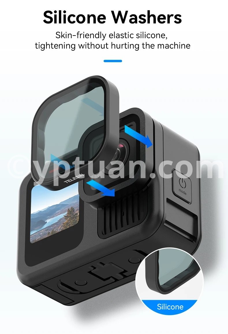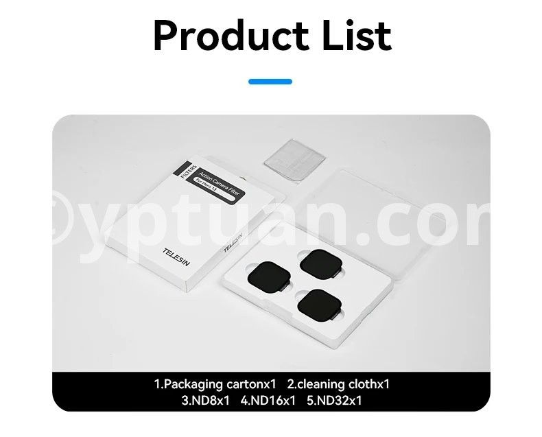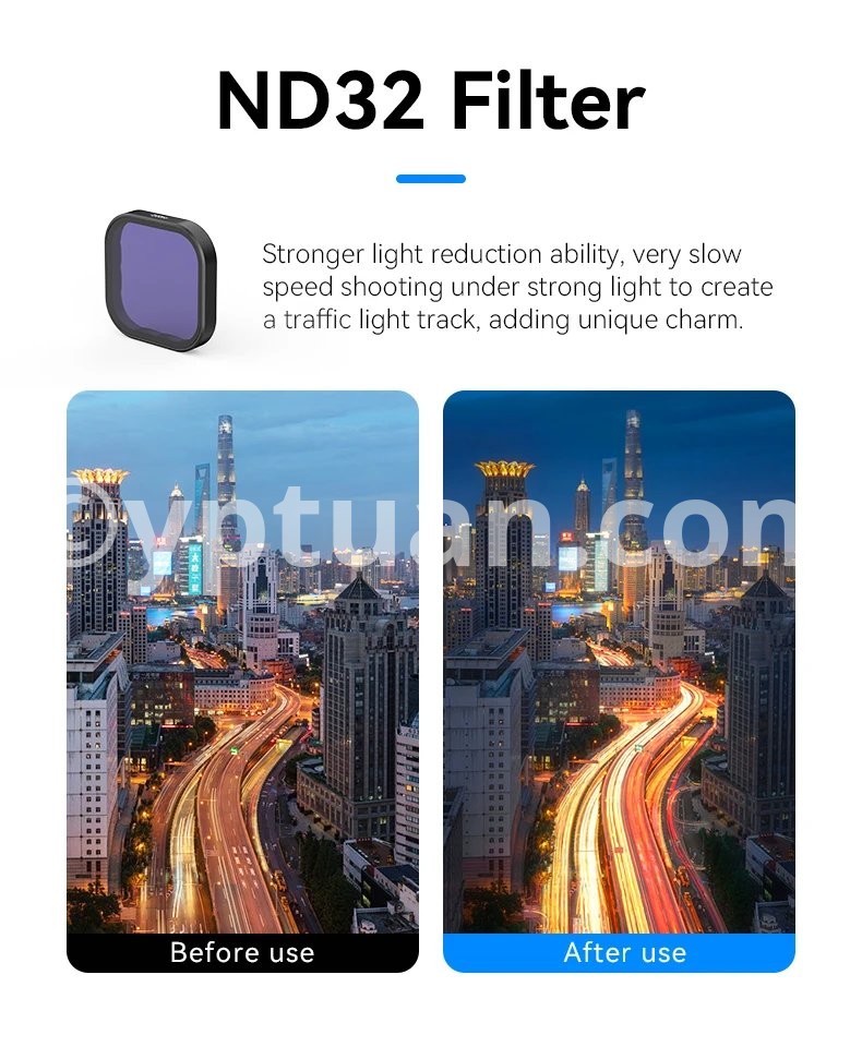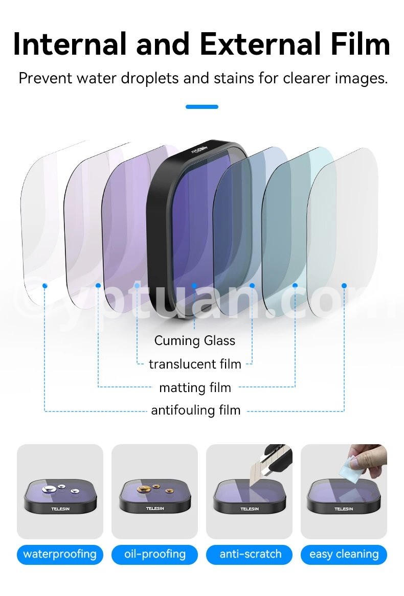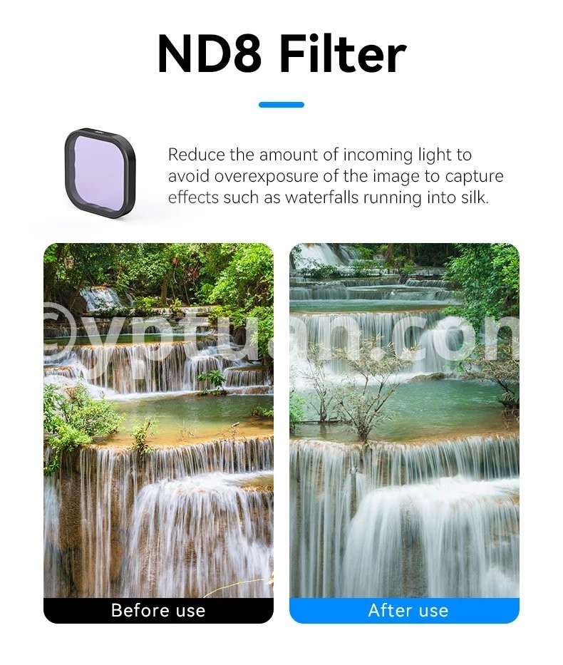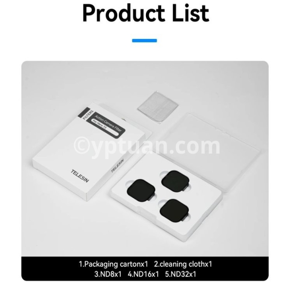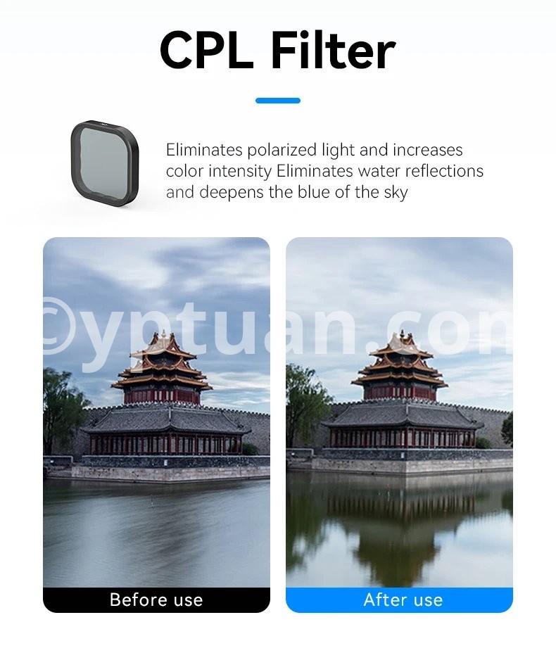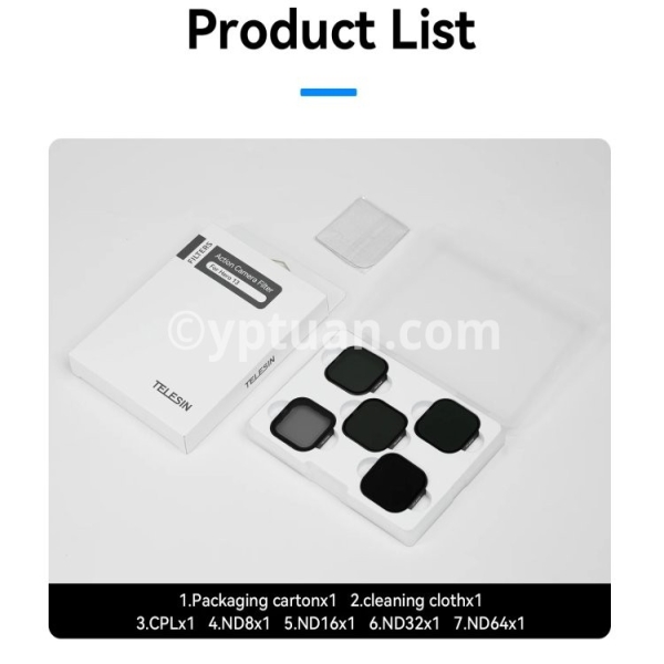 【High Light Transmittance for Superior Image Quality】This lens filter kit design with extremely high light transmission ensures that the camera shoots without any interference and always maintains a clear image. Also, TELESIN CPL Filter helps to reduce reflections or stray light entering the lens, such as reducing water or sky flare to enhance color saturation and contrast. ND Filters helps eliminate washed-out photos and videos caused by bright sunlight, enhancing contrast and color depth.