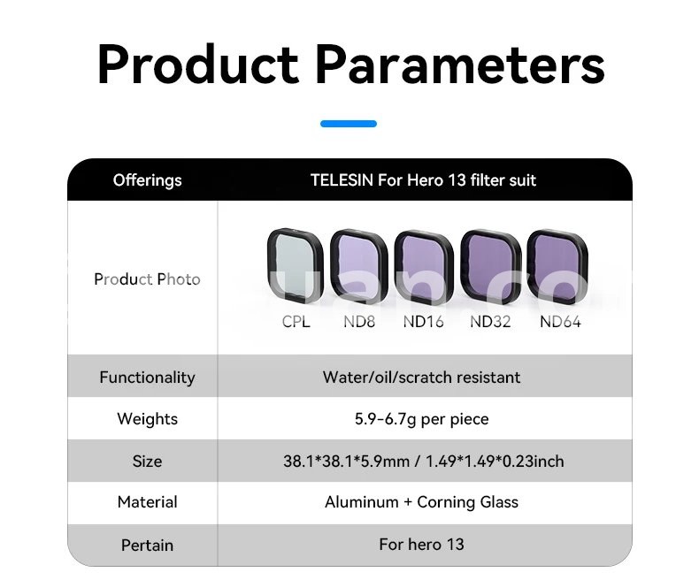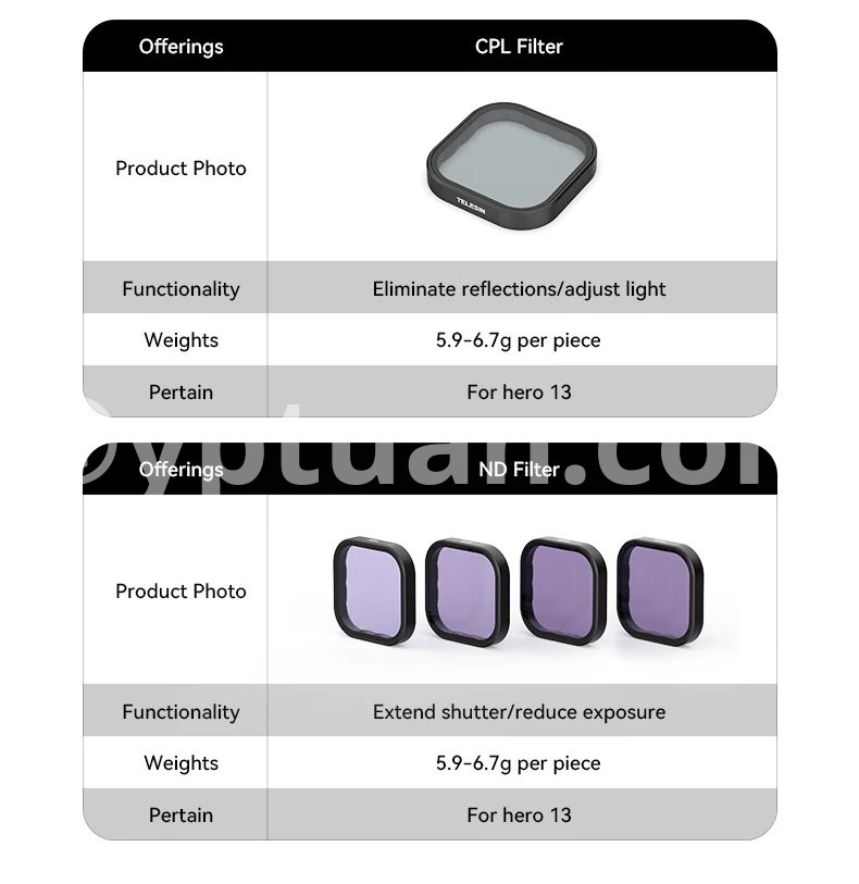 【Enhanced Control for Optimal Shooting】TELESIN CPL polarizing filter easily removes unwanted reflections, such as scattered light in the air, metal and water reflections, and improves image contrast and color saturation, making each of your photos vivid and natural. TELESIN ND Filters allow you to better control the camera’s aperture, exposure time, and sensor sensitivity in various lighting conditions, giving you the freedom to create your own unique shots.