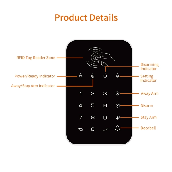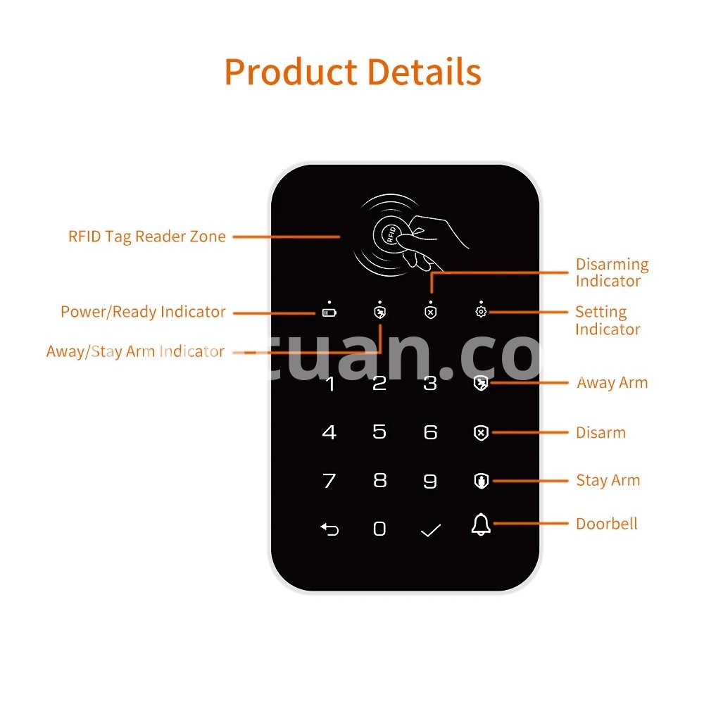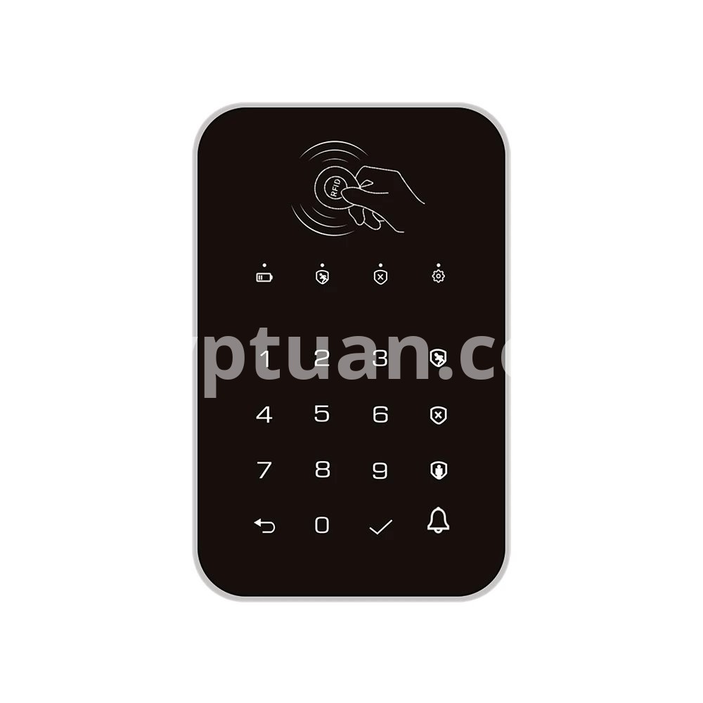 The Wireless keyboard can be connected to the 433MHz frequency encoding method EV1527 alarm host to work, and arming and disarming can be realized.