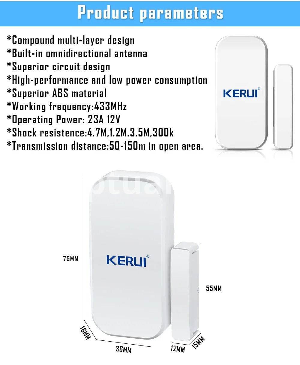 1, Transmission frequency: 433MHz 2, Operating Power: 1*23A 12V Battery(not including) 3, Built-in Antenna 4, It will send the alarm signal to control host once the door or window is opened