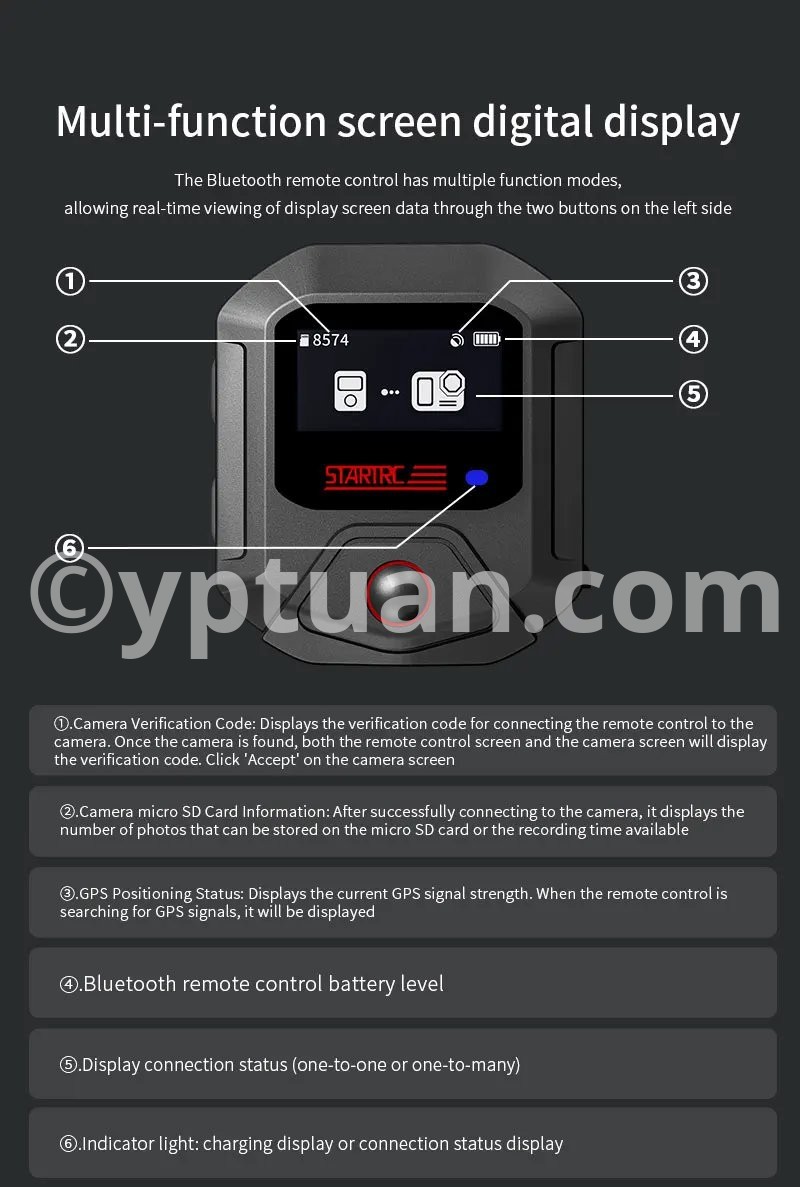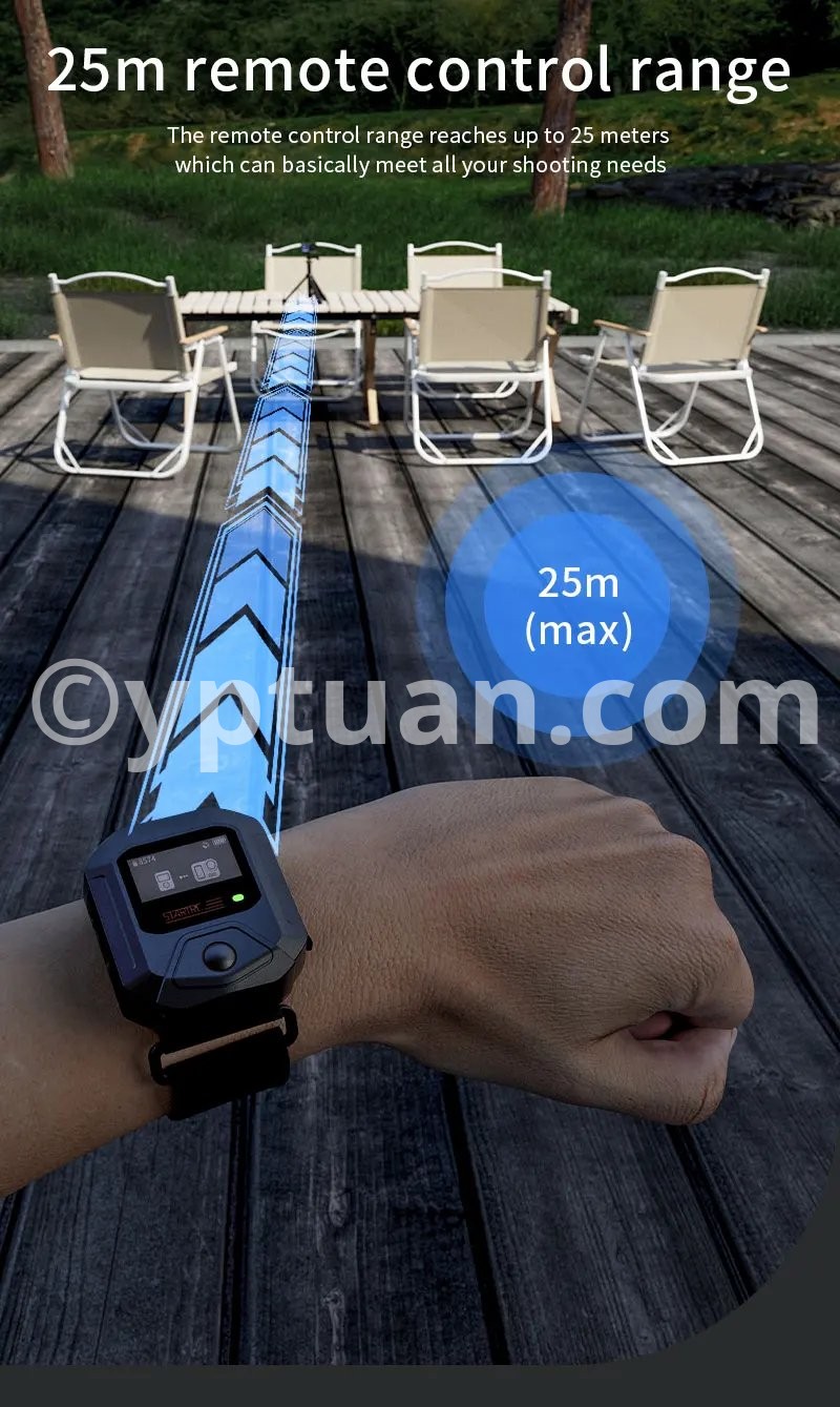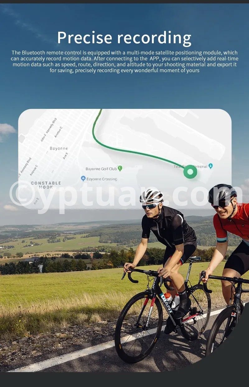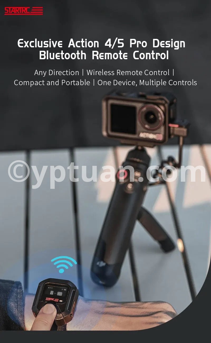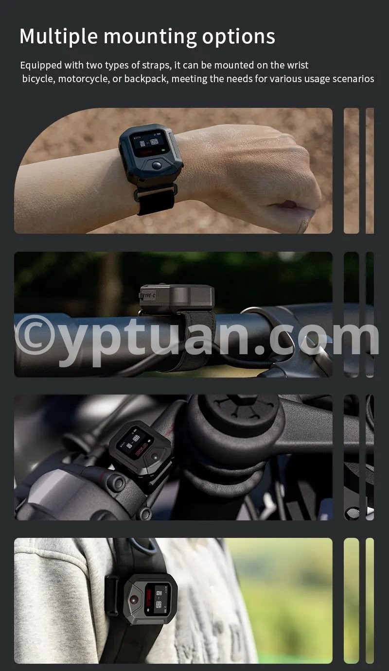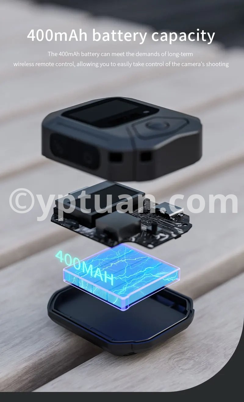 Features: 1. 25-meter ultra-long-range remote control for complete control over shooting With a remote control range of up to 25 meters, it meets the needs of long-distance shooting for activities such as skiing, cycling, and mountain climbing. There is no need to frequently approach the camera, allowing you to easily capture dynamic and exciting moments. 2. Precise GPS motion data overlay, recording professional trajectories Equipped with a multi-mode satellite positioning module, it records real-time motion data such as speed, route, and altitude, and synchronously overlays this data onto the footage. Connect to the app for one-click export, adding professional-level motion analysis to your adventure journey. 3. Multi-camera control & multiple wearing options for seamless use in various scenarios A single remote controller can be paired with multiple cameras, enhancing team collaboration efficiency; equipped with dual mounting straps compatible with wrists, bicycles, backpacks, and more, meeting installation needs for skiing, cycling, hiking, and other scenarios. 4. Compact and portable + dual fast-charging design, ready to use anytime With a miniaturized body of just 46×40×12.5mm, it’s lightweight and nearly weightless; Type-C fast-charging technology supports full charge in 2 hours, enabling uninterrupted outdoor shooting. The screen displays battery level, SD card capacity, and GPS signal in real time, with intuitive controls. 5. Smart buttons for one-stop control, integrating professional features One-button wake/sleep for the camera, quick mode switching, and real-time device status monitoring; a short press of the shutter button instantly starts recording, paired with a stable Bluetooth 5.0 connection for precise response even in complex environments. Compatible models: Action4/5 Pro Weight: 98g (including wrist strap) Body dimensions: 46×40×12.5mm Battery capacity: 400mAh Charging time: Approximately 2 hours (Type-C port) Remote control range: 25 meters Waterproof rating: IPX4 Operating temperature: -10°C to 45°C Bluetooth protocol: BLE 5.0 Multi-device control: Supported (1-to-many) Display information: Battery level/GPS/SD card capacity/connection status Mounting method: Dual wrist straps (wrist/handlebar/backpack)"