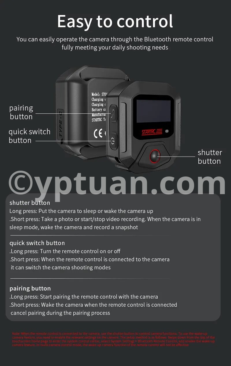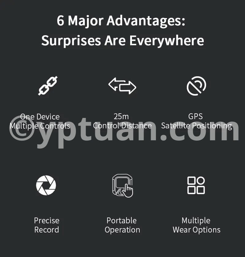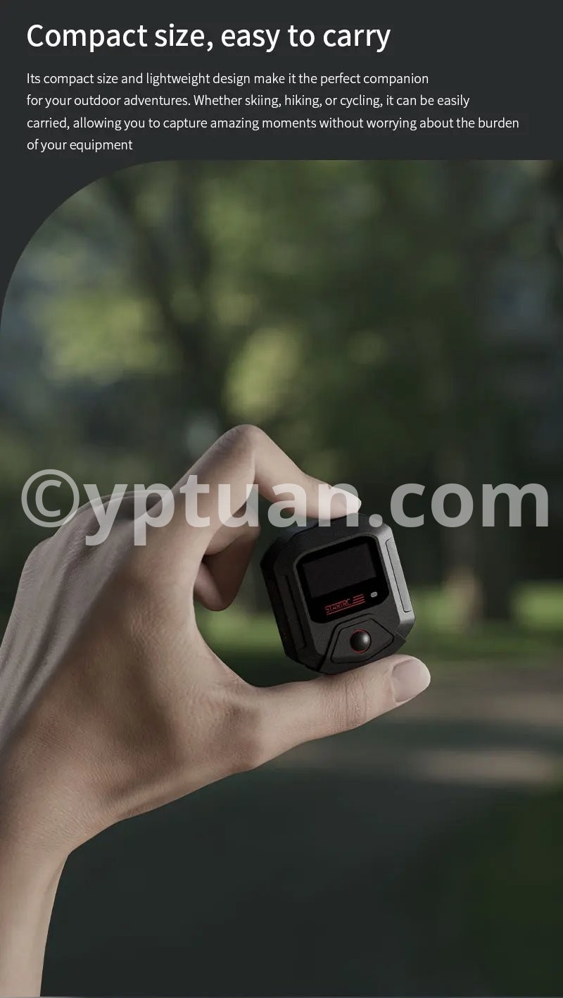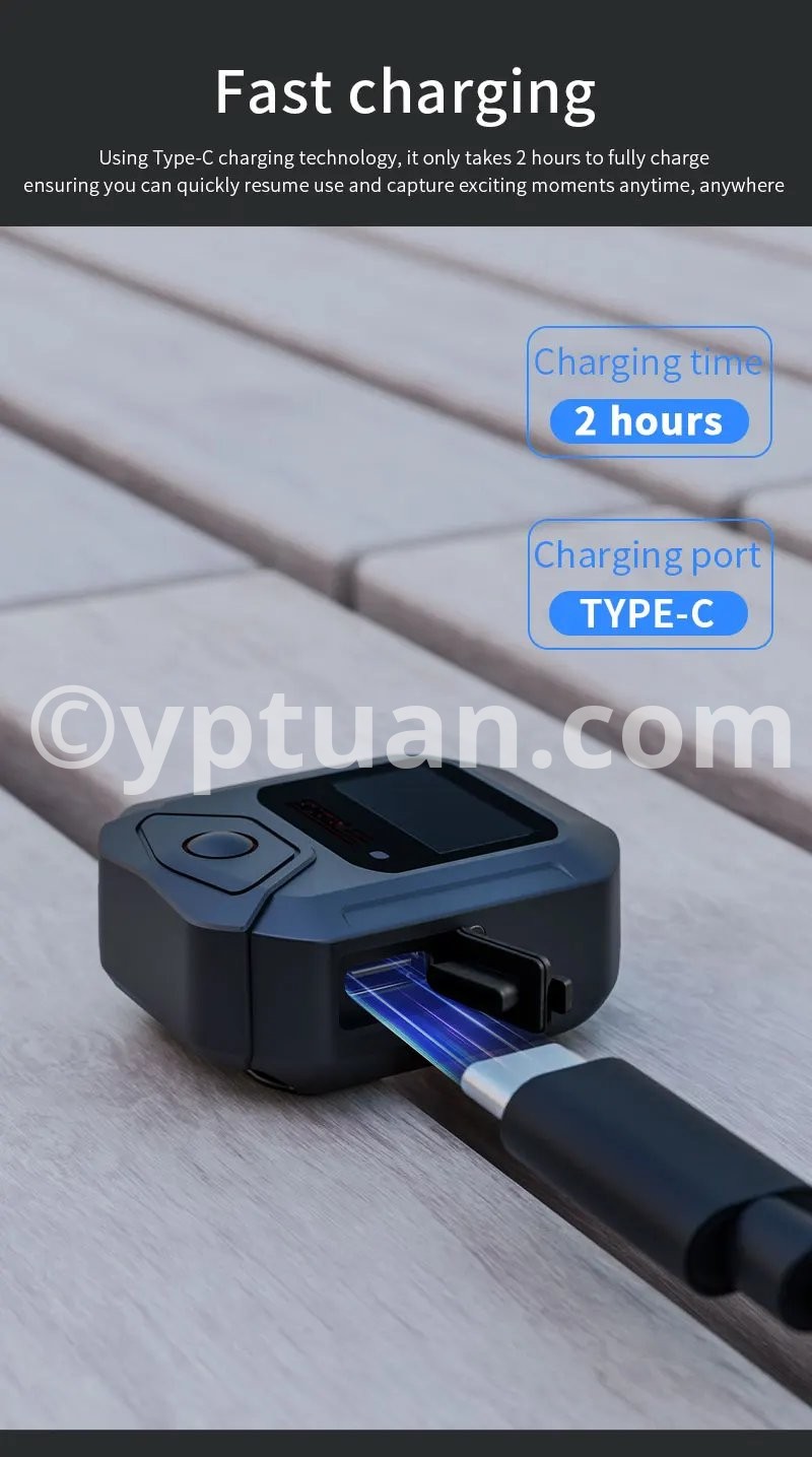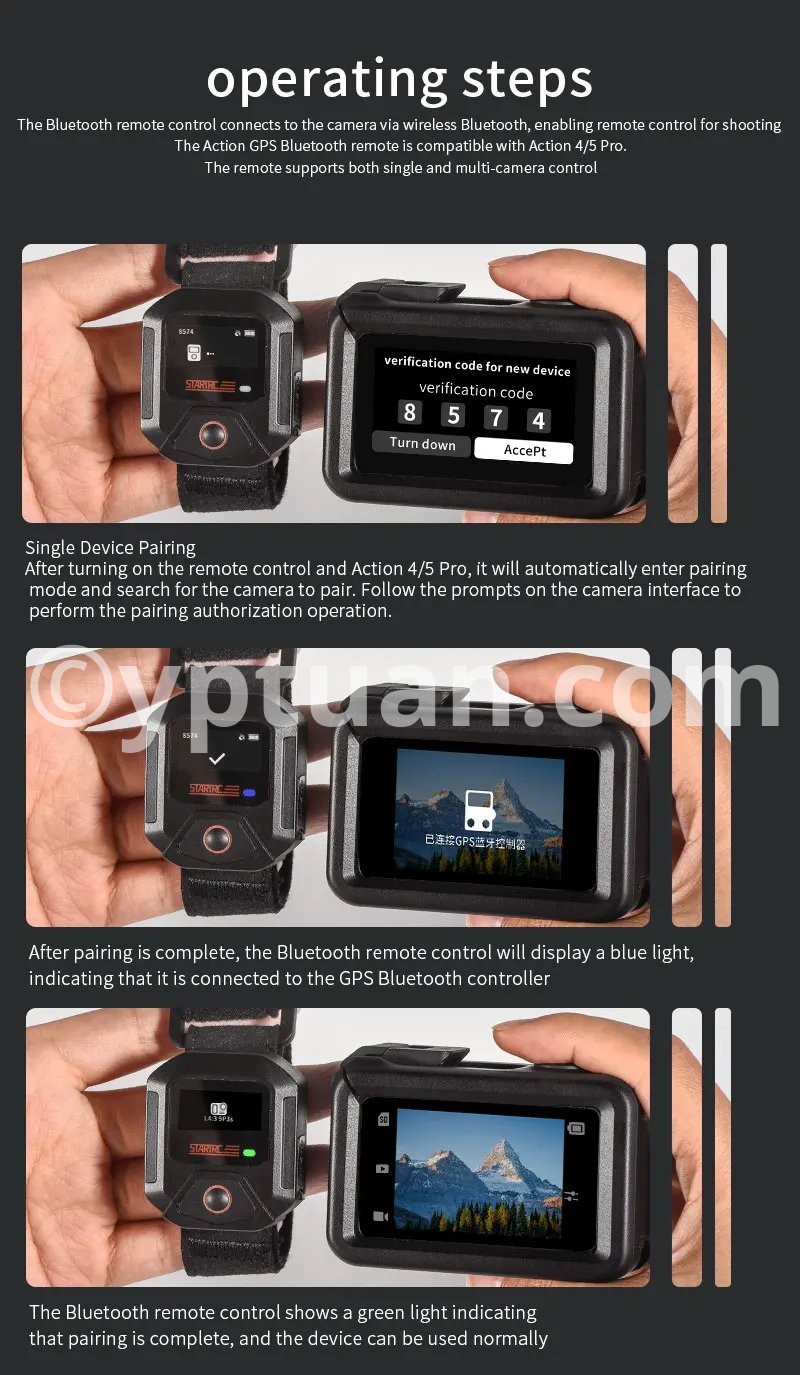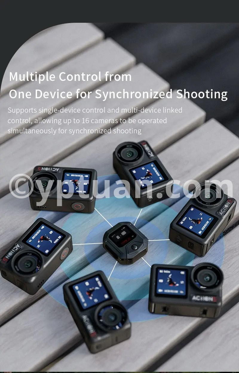 Features: 1. 25-meter ultra-long-range remote control for complete control over shooting With a remote control range of up to 25 meters, it meets the needs of long-distance shooting for activities such as skiing, cycling, and mountain climbing. There is no need to frequently approach the camera, allowing you to easily capture dynamic and exciting moments. 2. Precise GPS motion data overlay, recording professional trajectories Equipped with a multi-mode satellite positioning module, it records real-time motion data such as speed, route, and altitude, and synchronously overlays this data onto the footage. Connect to the app for one-click export, adding professional-level motion analysis to your adventure journey. 3. Multi-camera control & multiple wearing options for seamless use in various scenarios A single remote controller can be paired with multiple cameras, enhancing team collaboration efficiency; equipped with dual mounting straps compatible with wrists, bicycles, backpacks, and more, meeting installation needs for skiing, cycling, hiking, and other scenarios. 4. Compact and portable + dual fast-charging design, ready to use anytime With a miniaturized body of just 46×40×12.5mm, it’s lightweight and nearly weightless; Type-C fast-charging technology supports full charge in 2 hours, enabling uninterrupted outdoor shooting. The screen displays battery level, SD card capacity, and GPS signal in real time, with intuitive controls. 5. Smart buttons for one-stop control, integrating professional features One-button wake/sleep for the camera, quick mode switching, and real-time device status monitoring; a short press of the shutter button instantly starts recording, paired with a stable Bluetooth 5.0 connection for precise response even in complex environments. Compatible models: Action4/5 Pro Weight: 98g (including wrist strap) Body dimensions: 46×40×12.5mm Battery capacity: 400mAh Charging time: Approximately 2 hours (Type-C port) Remote control range: 25 meters Waterproof rating: IPX4 Operating temperature: -10°C to 45°C Bluetooth protocol: BLE 5.0 Multi-device control: Supported (1-to-many) Display information: Battery level/GPS/SD card capacity/connection status Mounting method: Dual wrist straps (wrist/handlebar/backpack)"