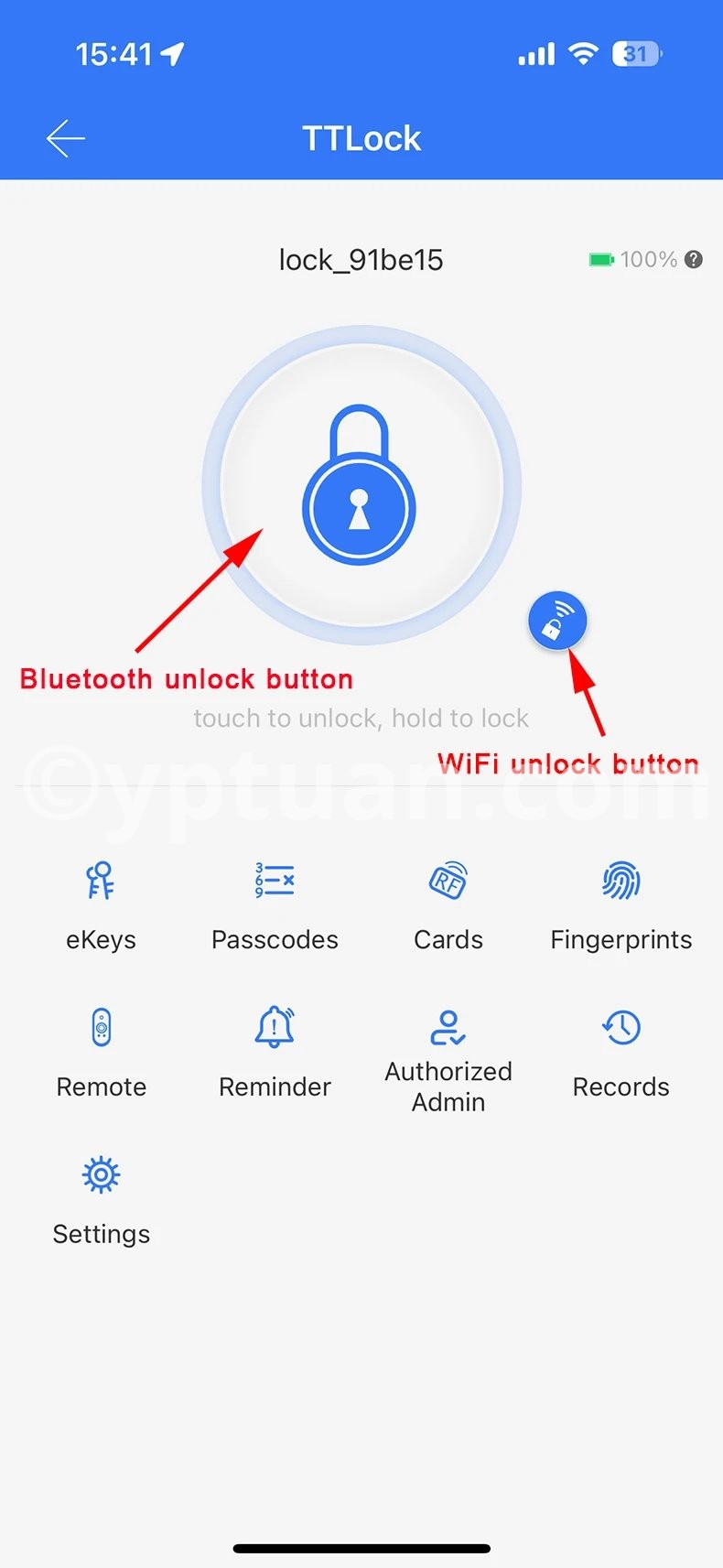2. The big button of TTLock APP is for bluetooth unlock, the small button of TTLock APP is for WiFi unlock.