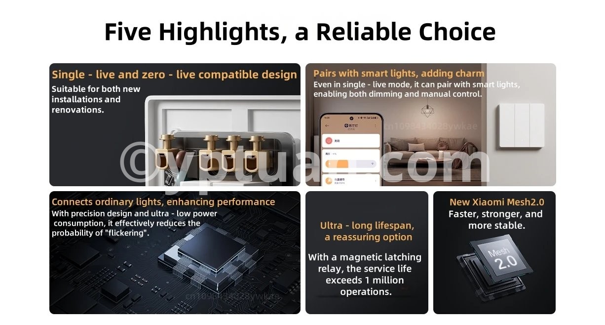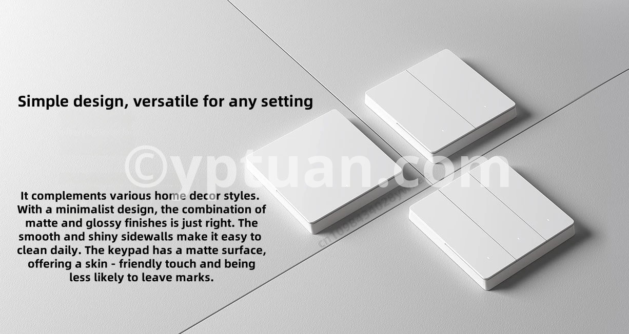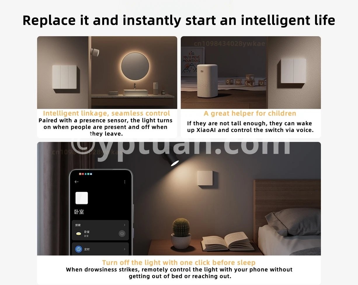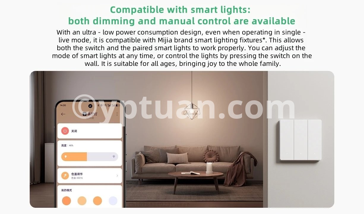 *Compatible con el control manual de atenuación de luz inteligente y el diseño de consumo de energía ultrabajo, incluso cuando se trabaja en modo de fuego único, puede ser compatible con los accesorios de iluminación inteligentes de la marca Mi Home *, lo que permite que el interruptor y la luz inteligente correspondiente funcionen normalmente al mismo tiempo.Puede ajustar el modo de iluminación inteligente en cualquier momento o controlar la luz presionando manualmente el botón del interruptor de pared.