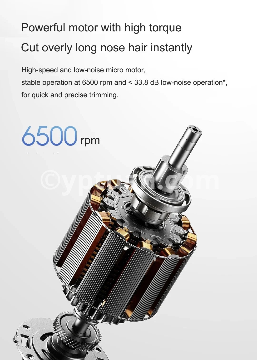 Powerful motor with large torque can cut long nose hair instantly. High-speed and low-noise micro motor, stable operation at 6500 rpm, ≤ 33.8 dB low-noise operation*, fast and precise trimming.