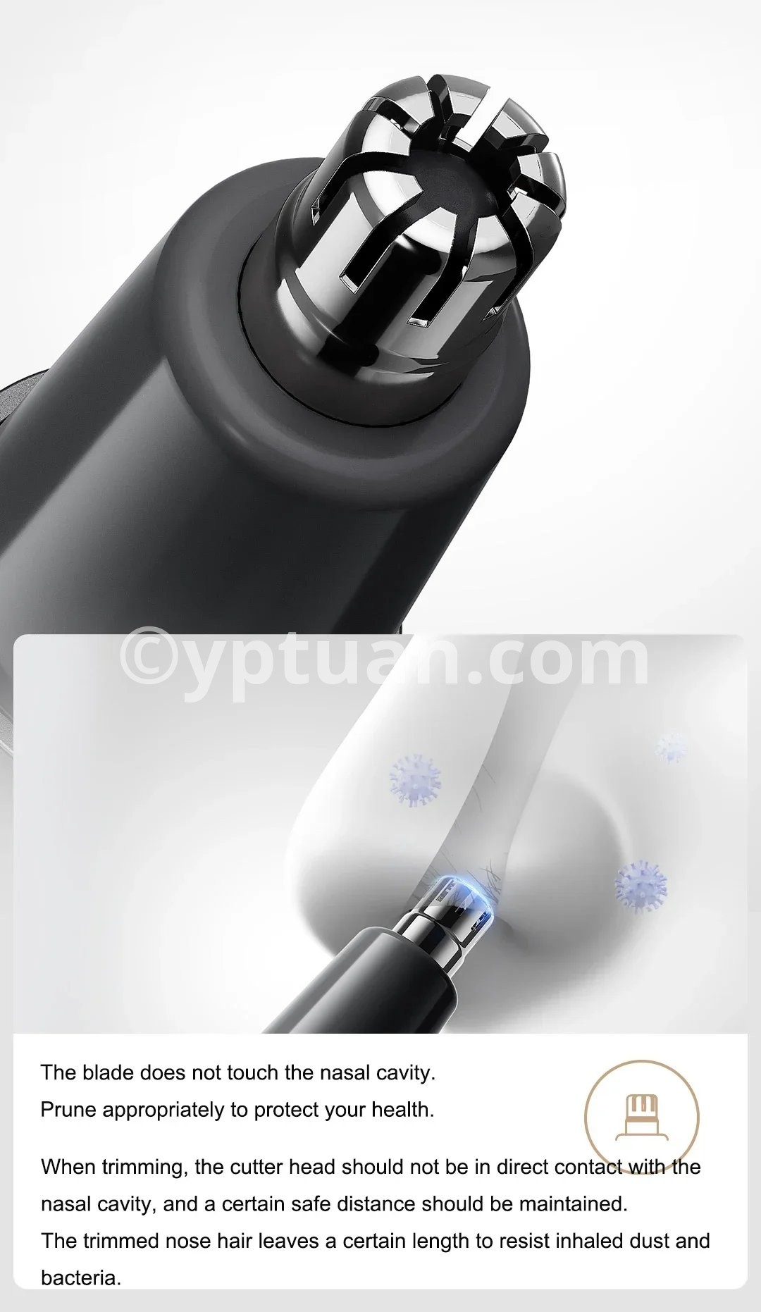 Three-dimensional arched blade, Round and smooth, full of security. Equipped with a double-edged blade inside, it can remove nose hairs neatly, reduce pulling pain, and not damage sensitive nasal mucosa. It solves the embarrassment of nose hairs and can be used without worries. When trimming, the cutter head should not be in direct contact with the nasal cavity, and a certain safe distance should be maintained. The trimmed nose hair leaves a certain length to resist inhaled dust and bacteria.