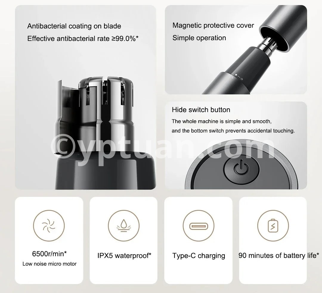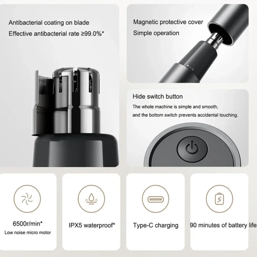 Original XIAOMI Mijia Electric Nose Hair Trimmer Portable Nose Ears Hair Eyebrow Trimmer for Men Rechargeable Painless Clipper Note: This product is the Xiaomi China version. There is only the Mijia Logo on the product, no Xiaomi Logo. Please understand. Main features of the XIAOMI Mijia Electric Nose Hair Trimmer: - The cutter head has an antibacterial coating, with an effective antibacterial rate of ≥99.0%*. - Portable compact design as small as a pen and can be carried anywhere. - Magnetic protective cap, easy to operate. - Hidden switch button at the bottom prevents accidental touch. - Effective nose hair trimmer with 6500 rpm low noise micro motor. - IPX5 waterproof - Type-C charging, convenient for use. - 90 minutes long battery life* - Detachable cutter head, removable for cleaning.