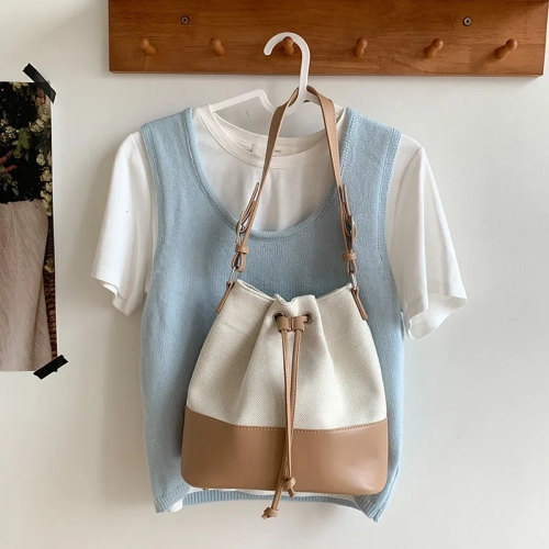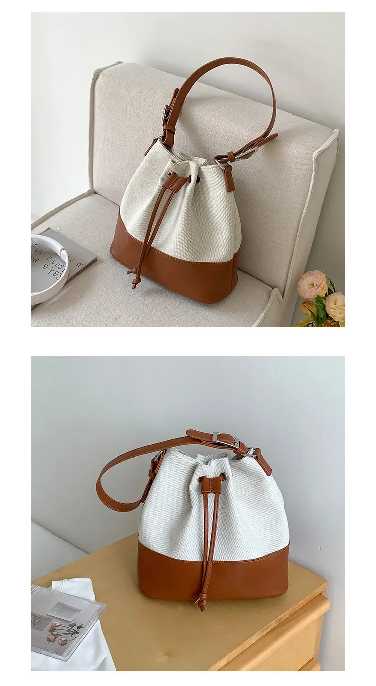 Korean Style Fashion Large Luxury Bag Capacity Canvas Patchwork Drawstring Bucket Designer Bag Bag Women's Versatile Casual Shoulder Bag Women's Bags