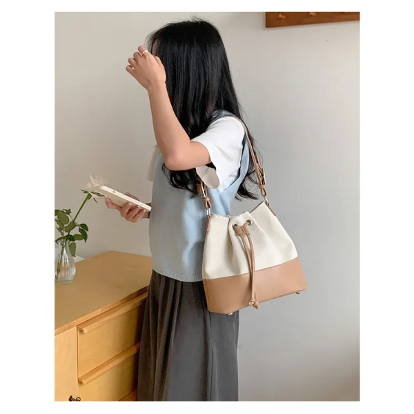 2025 New Korean Drawstring Patchwork Single Shoulder Bag for Women, Niche Fashion, Large Capacity Commuter Canvas Bag