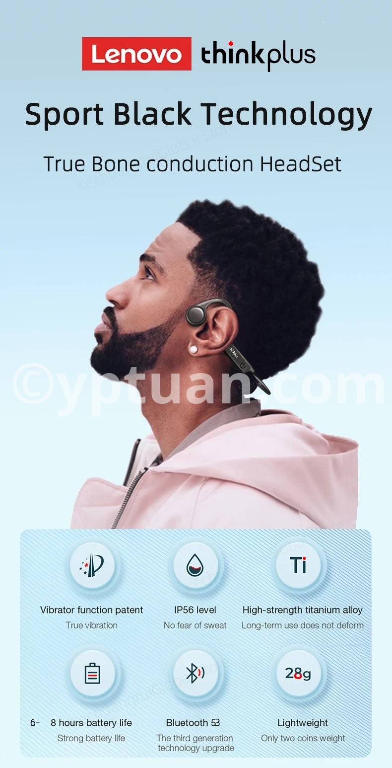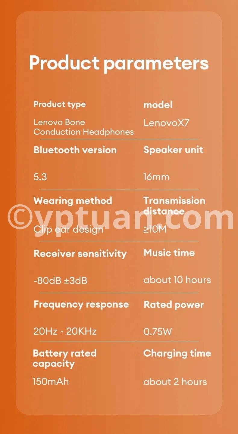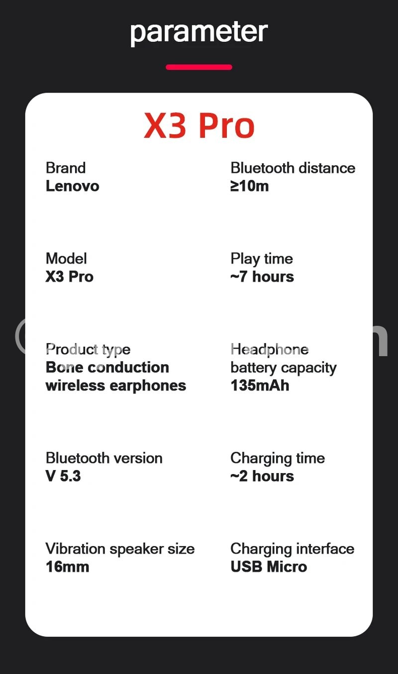 1. Lenovo X3 Pro BT headset true bone conduction, all sound is produced by patented vibrator. Truly achieve the ideal effect of not damaging the eardrum. 2. 16MM Large moving unit,upgrade the sound quality again and make the sound more penetrating 3. BT 5.3 technology bring faster paring with your device and more stable connection with ultra-low latency. 4. With ergonomic on-ear design, only 25g in weight, super stable and o sense of weight wearing experience. 5. Seven Hour lasting endurance to meet your using needs, IP56 Sports waterproof, effectively reduce sound leakage