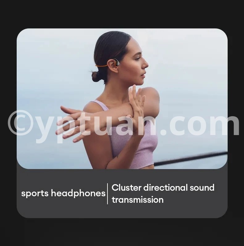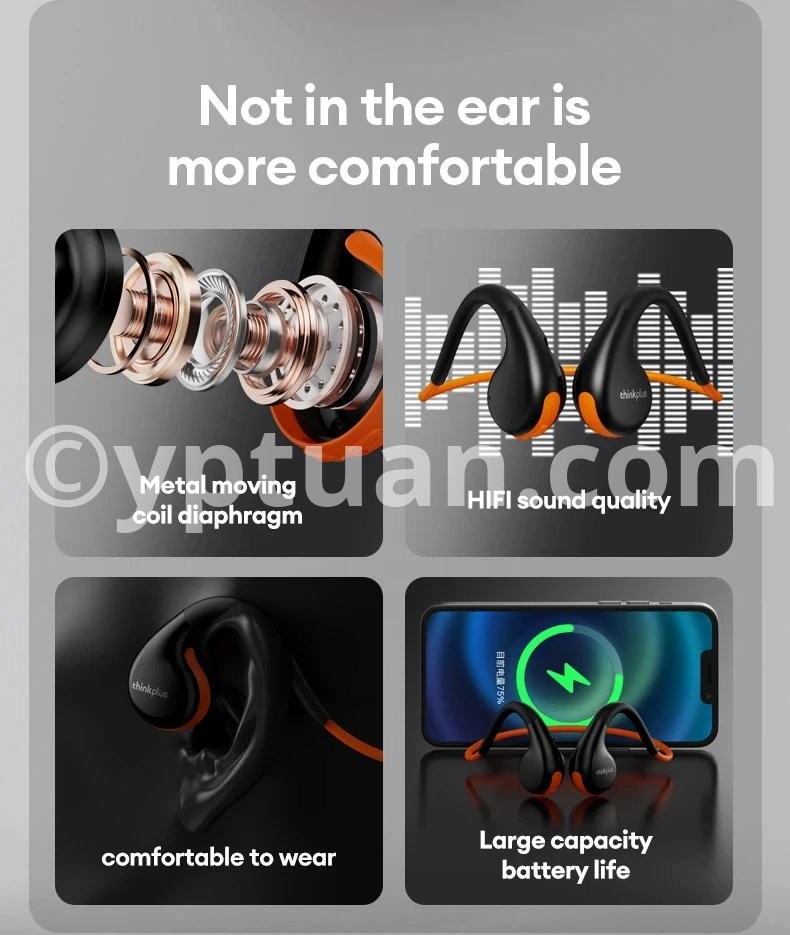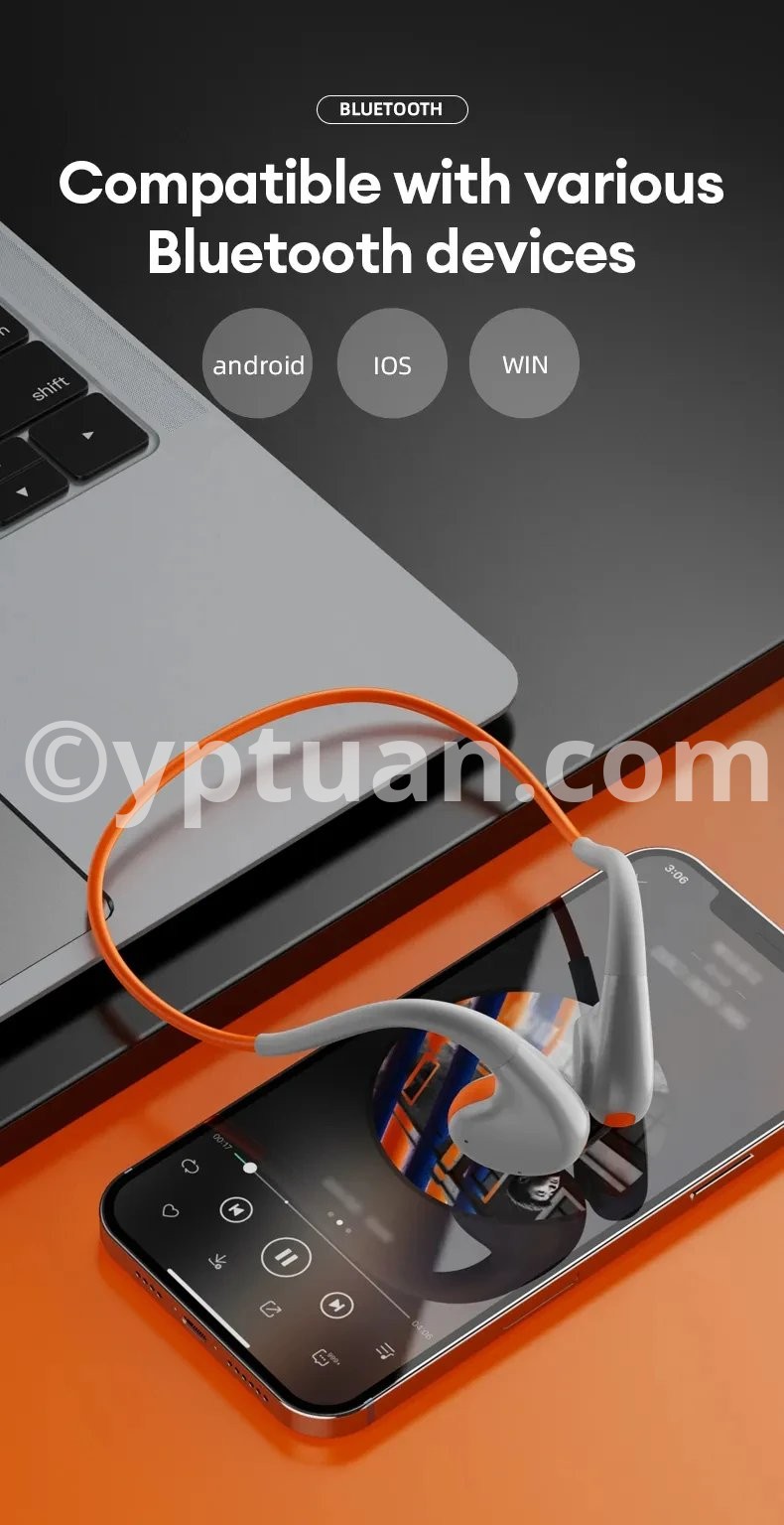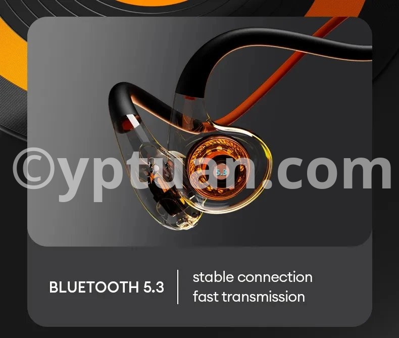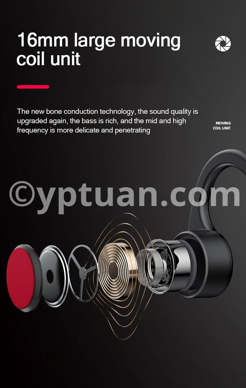1. New Air conduction technology, 16mm large moving coil unit ,Bluetooth version: 5.3 2. Effectively reduce sound leakage, sound insulation and vibration prevention 3. Stronger anti-interference ability, low latency, and smoother games 4. IPX5 sports waterproof, light to wear without burden 5. The directional vibrator is more comfortable to wear without in-ear 6. Vibration speaker size: 16mm 7. Bluetooth transmission distance: ≥10M 8. Music time: about 10 hours 9. Charging time: about 2 hours 10. Rated Power: 0.75W, 80±3dB 11. Headphone battery capacity: 150mAh