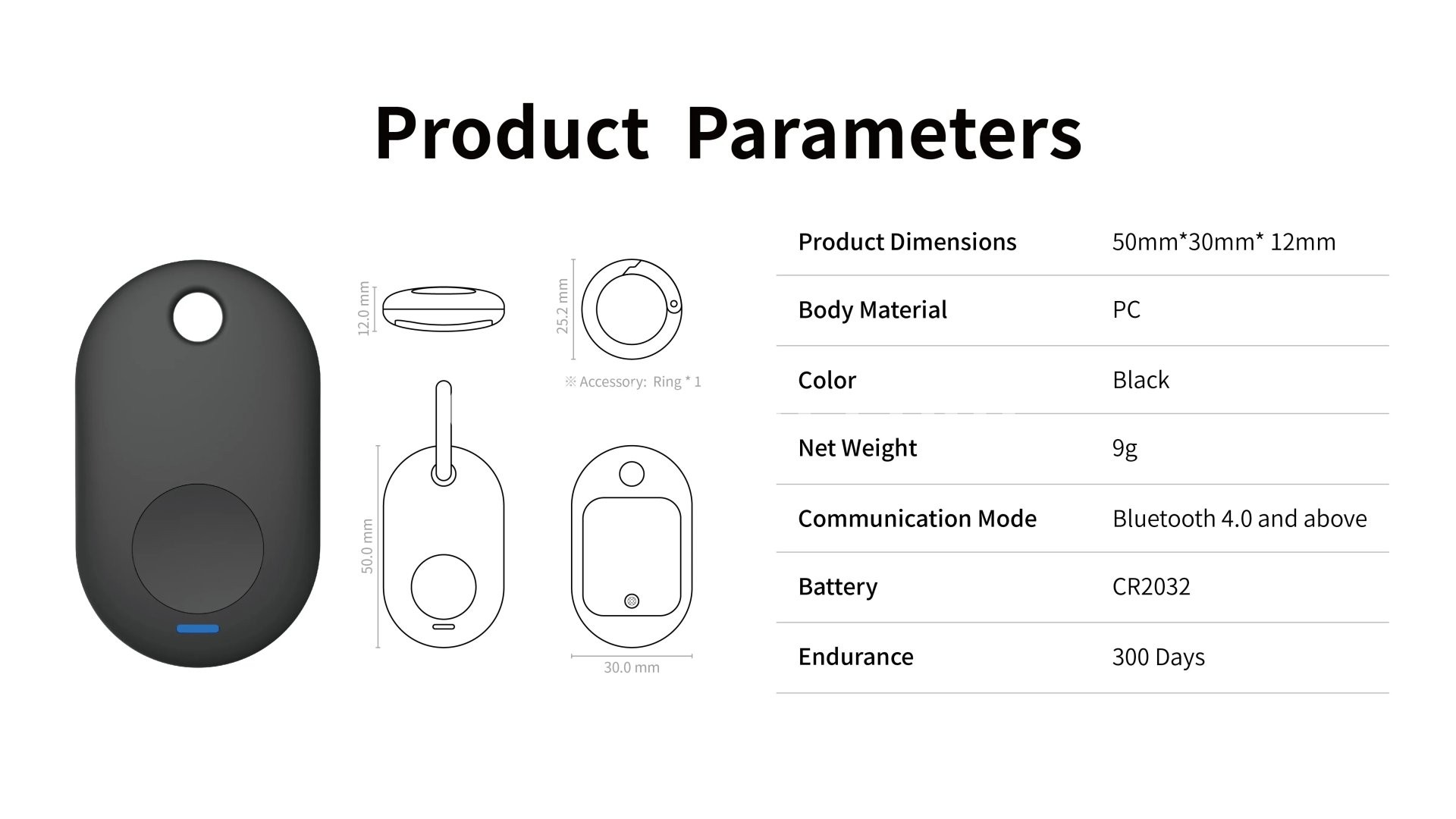 1. Product Dimensions: 50mm*30mm*12mm 2. Body Material: PC 3. Color:Black 4. Net Weight : 9g 5. Communication Mode:Bluetooth 4.0 and above 6. Battery: CR2032 7. Endurance:300 Days
