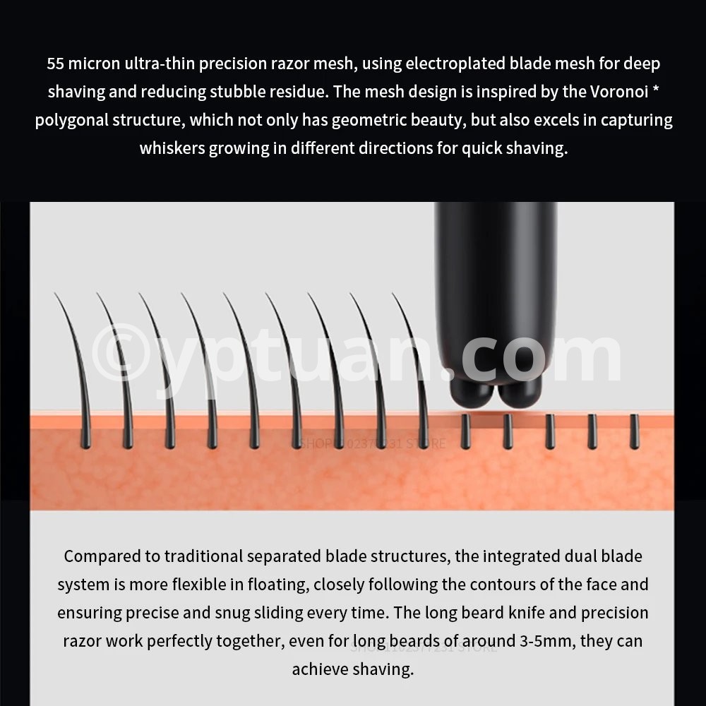 The integrated floating dual-blade system is more flexible than the traditional separate blade system, allowing the shaver head to tackle even the most complex facial contours, ensuring precision and comfort. The blade for long hairs and the precision blade perfectly complement each other to cleanly shave hairs as long as 3–5mm.