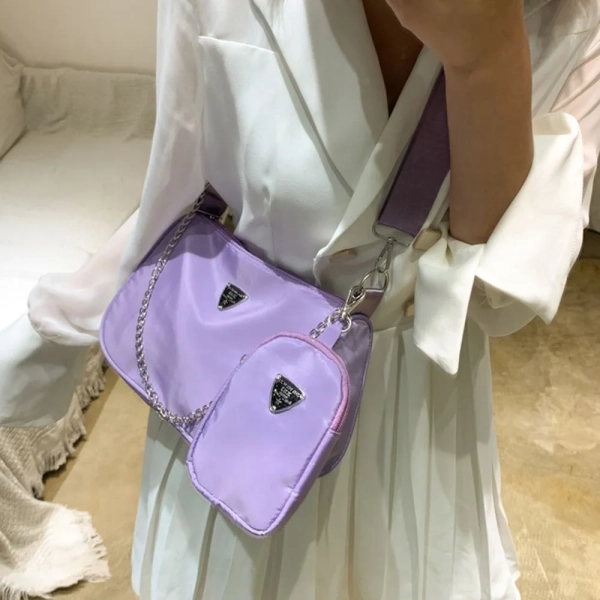 Bag style type: shoulder bag, crossbody bag, handbagBrand New And High QualityFeatures: Large capacity, divided into large and small bags, can store various cosmetics and other suppliesConvenient, portable, a good helper for shopping and travelingWith zipper, firm and not easy to fall offUnique shape, simpleMaterial: NylonSize: 26*17*8,14*9*3CMColor:White,Black,PurplePacking:1PCs